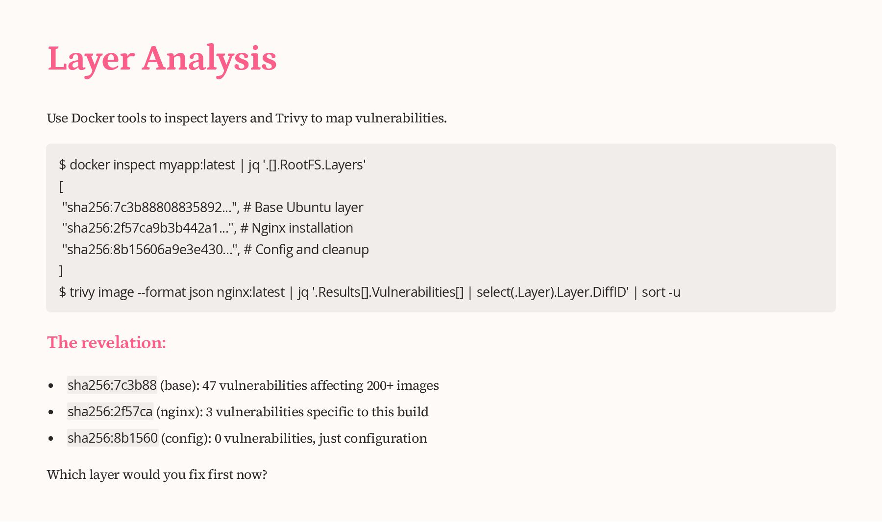 to map vulnerabilities. $ docker inspect myapp:latest | jq '.[].RootFS.Layers' [ "sha256:7c3b88808835892...", # Base Ubuntu layer "sha256:2f57ca9b3b442a1...", # Nginx installation "sha256:8b15606a9e3e430...", # Config and cleanup ] $ trivy image --format json nginx:latest | jq '.Results[].Vulnerabilities[] | select(.Layer).Layer.DiffID' | sort -u The revelation: sha256:7c3b88 (base): 47 vulnerabilities affecting 200+ images sha256:2f57ca (nginx): 3 vulnerabilities specific to this build sha256:8b1560 (config): 0 vulnerabilities, just configuration Which layer would you fix first now?