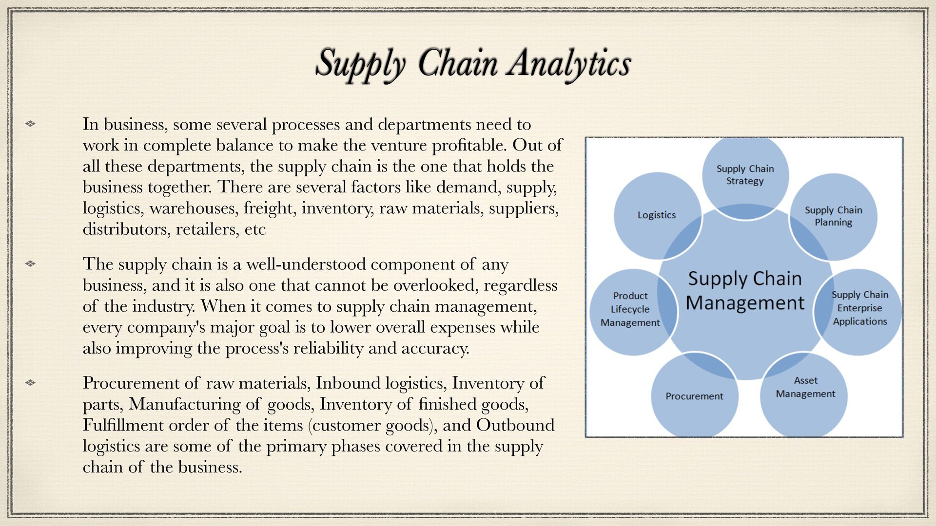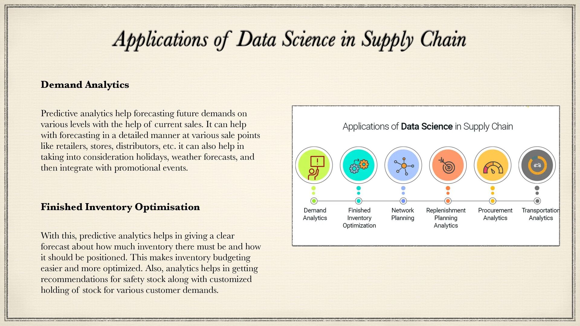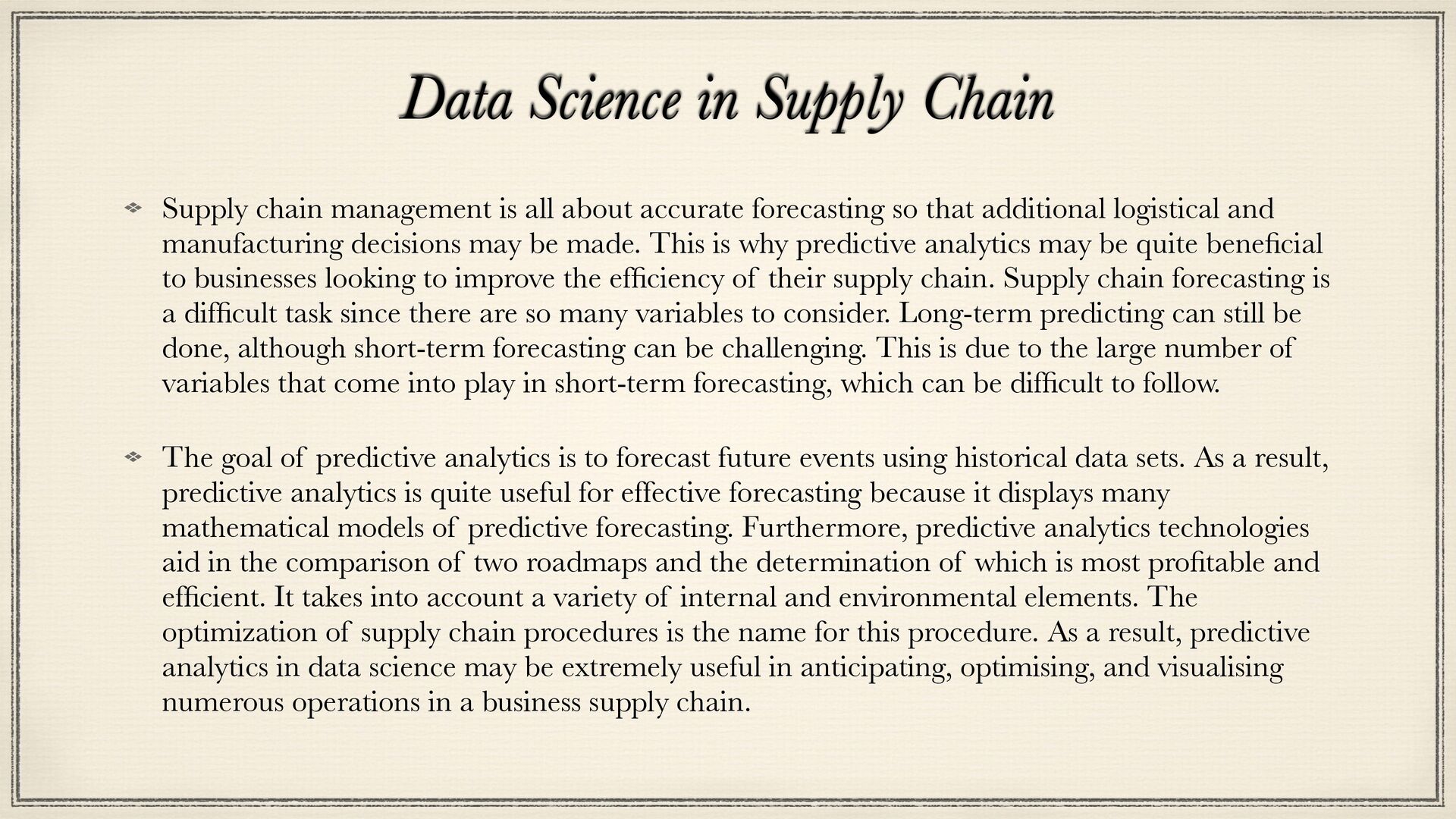 Domain knowledge, as opposed to general knowledge, is knowledge of a single, specialised topic or field. Considering Supply Chain as a domain, it has been explained with the emergence of data science how predictive analytics has been quite beneficial to businesses looking to improve the efficiency of their supply chain. The goal of predictive analytics is to forecast future events using historical data sets. As a result, predictive analytics is quite useful for effective forecasting because it displays many mathematical models of predictive forecasting. As a result, predictive analytics in data science is extremely useful in anticipating, optimising, and visualising numerous operations in a business supply chain.