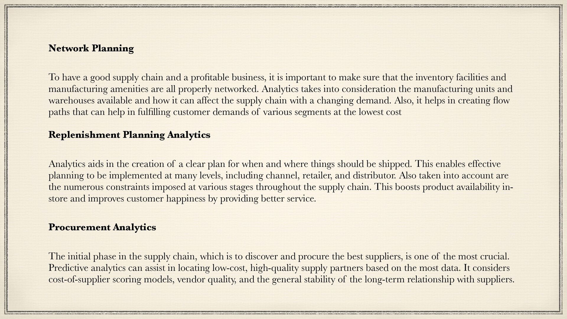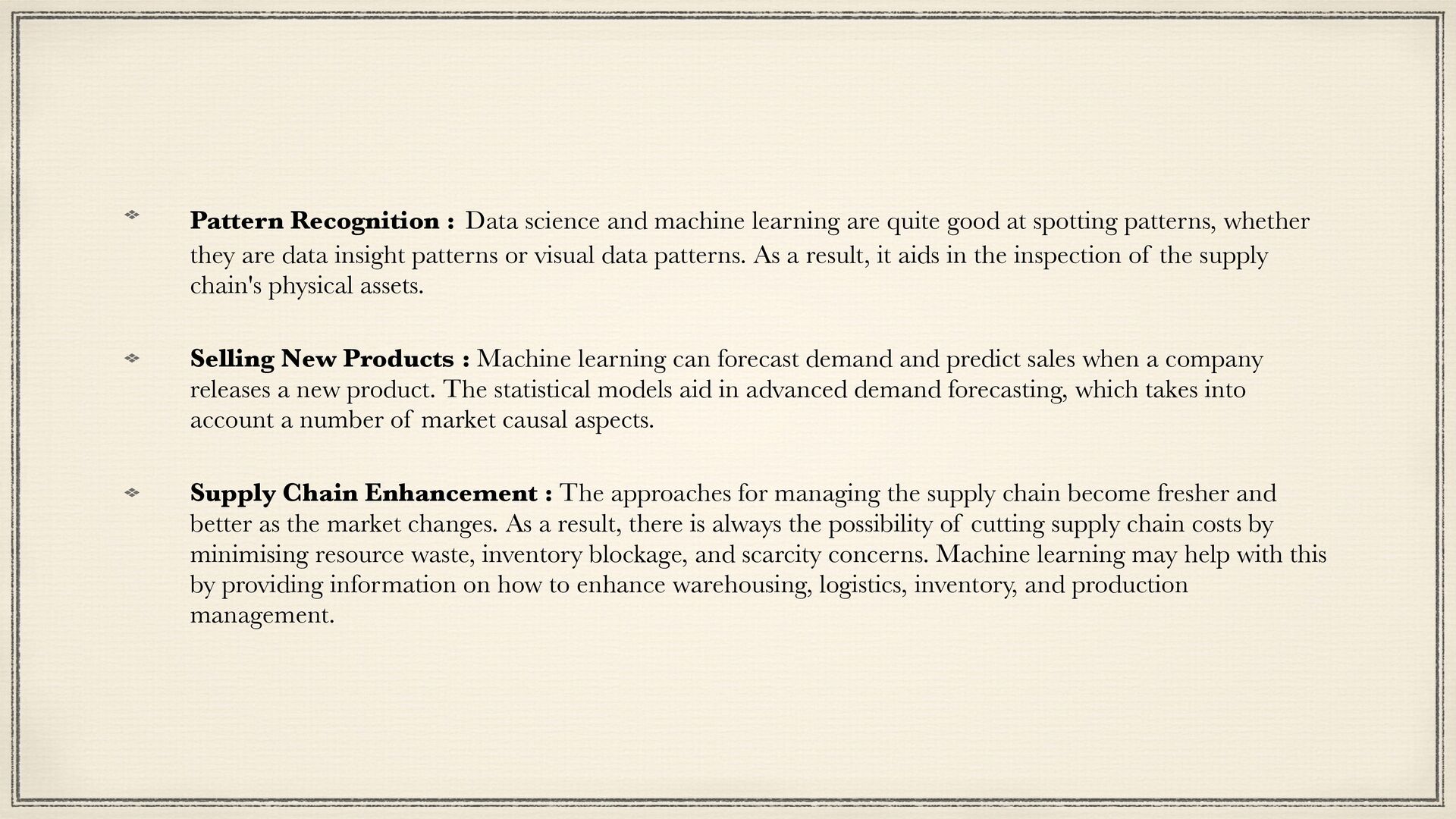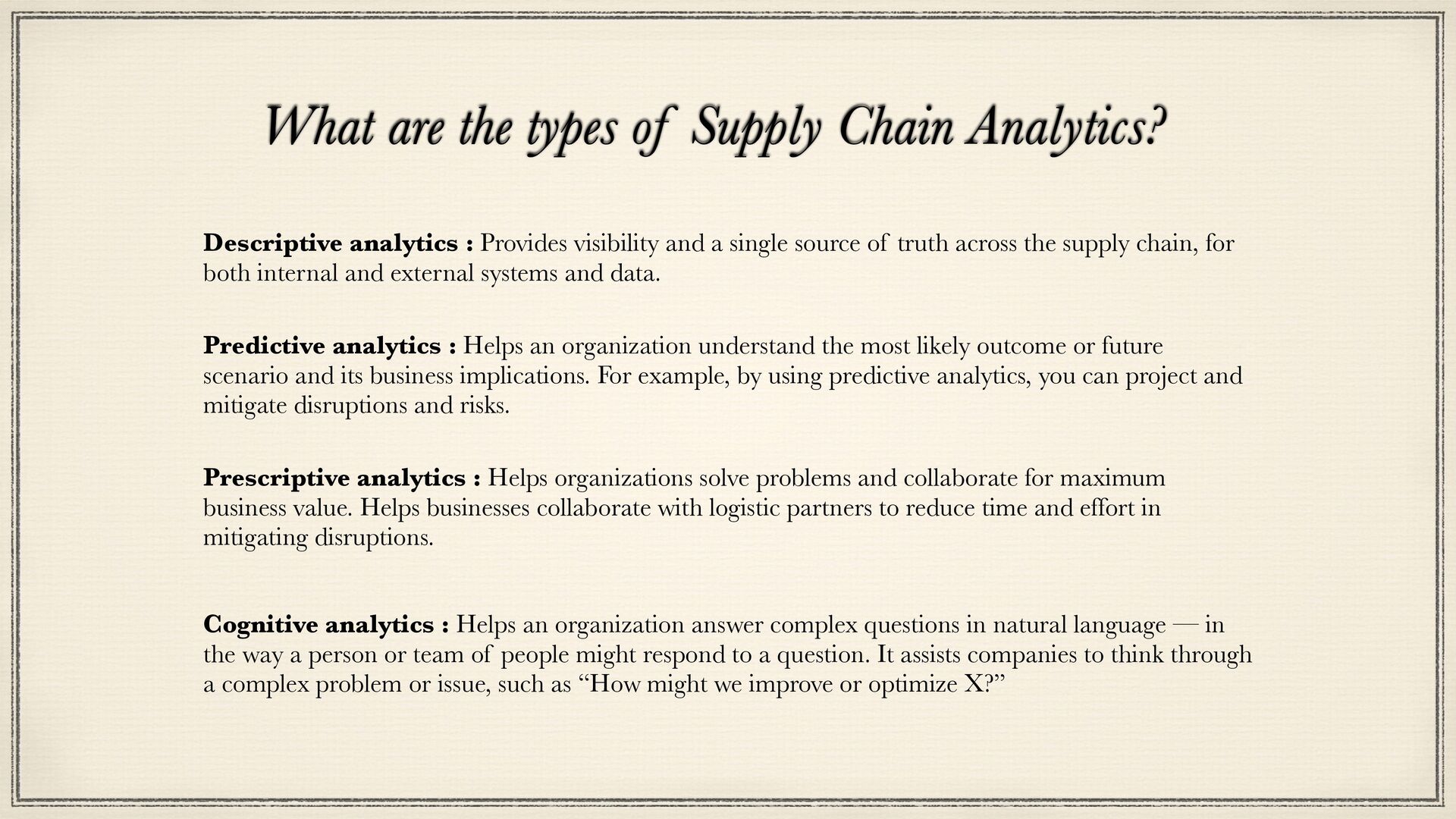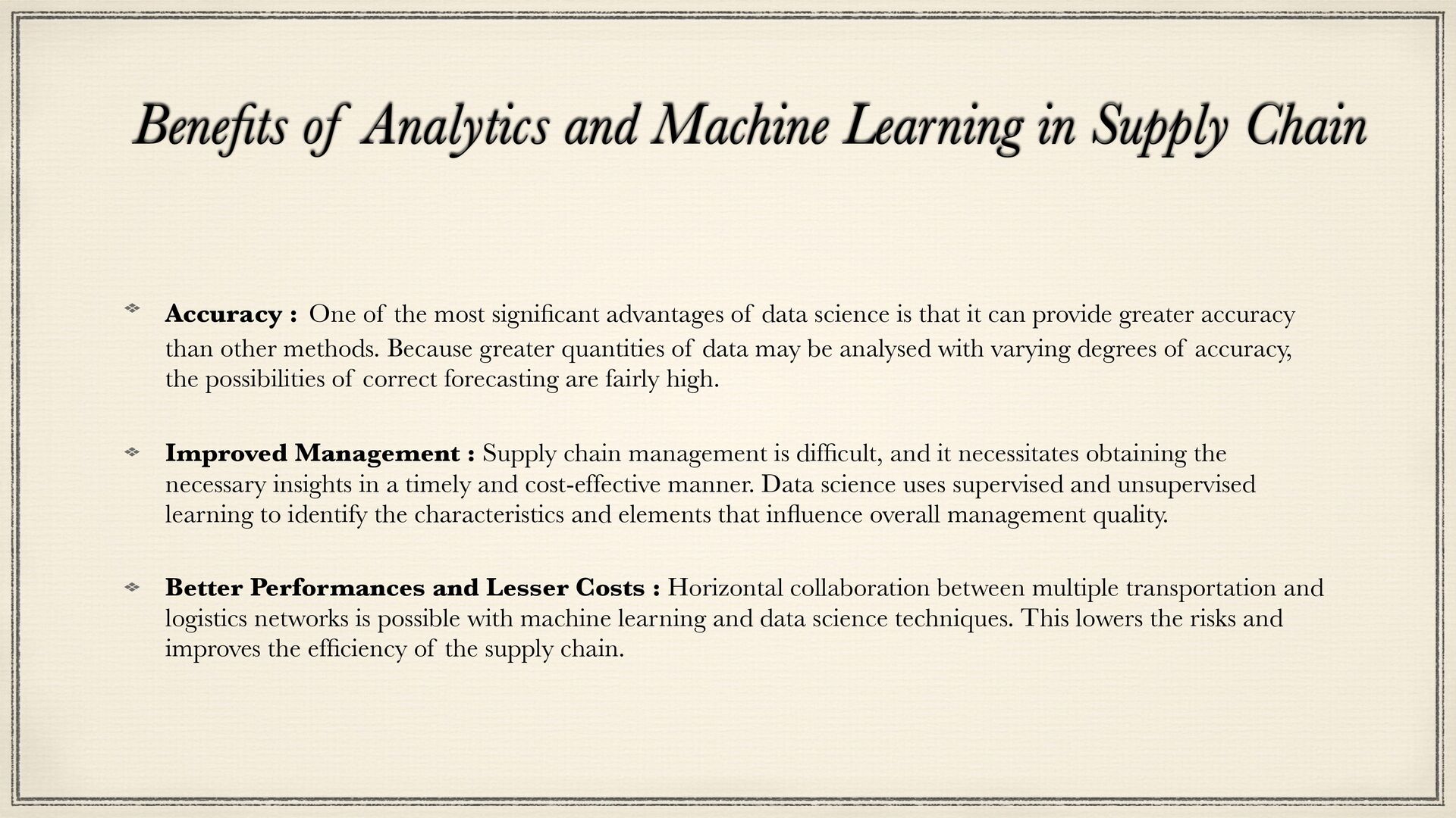 Domain knowledge, as opposed to general knowledge, is knowledge of a single, specialised topic or field. Considering Supply Chain as a domain, it has been explained with the emergence of data science how predictive analytics has been quite beneficial to businesses looking to improve the efficiency of their supply chain. The goal of predictive analytics is to forecast future events using historical data sets. As a result, predictive analytics is quite useful for effective forecasting because it displays many mathematical models of predictive forecasting. As a result, predictive analytics in data science is extremely useful in anticipating, optimising, and visualising numerous operations in a business supply chain.