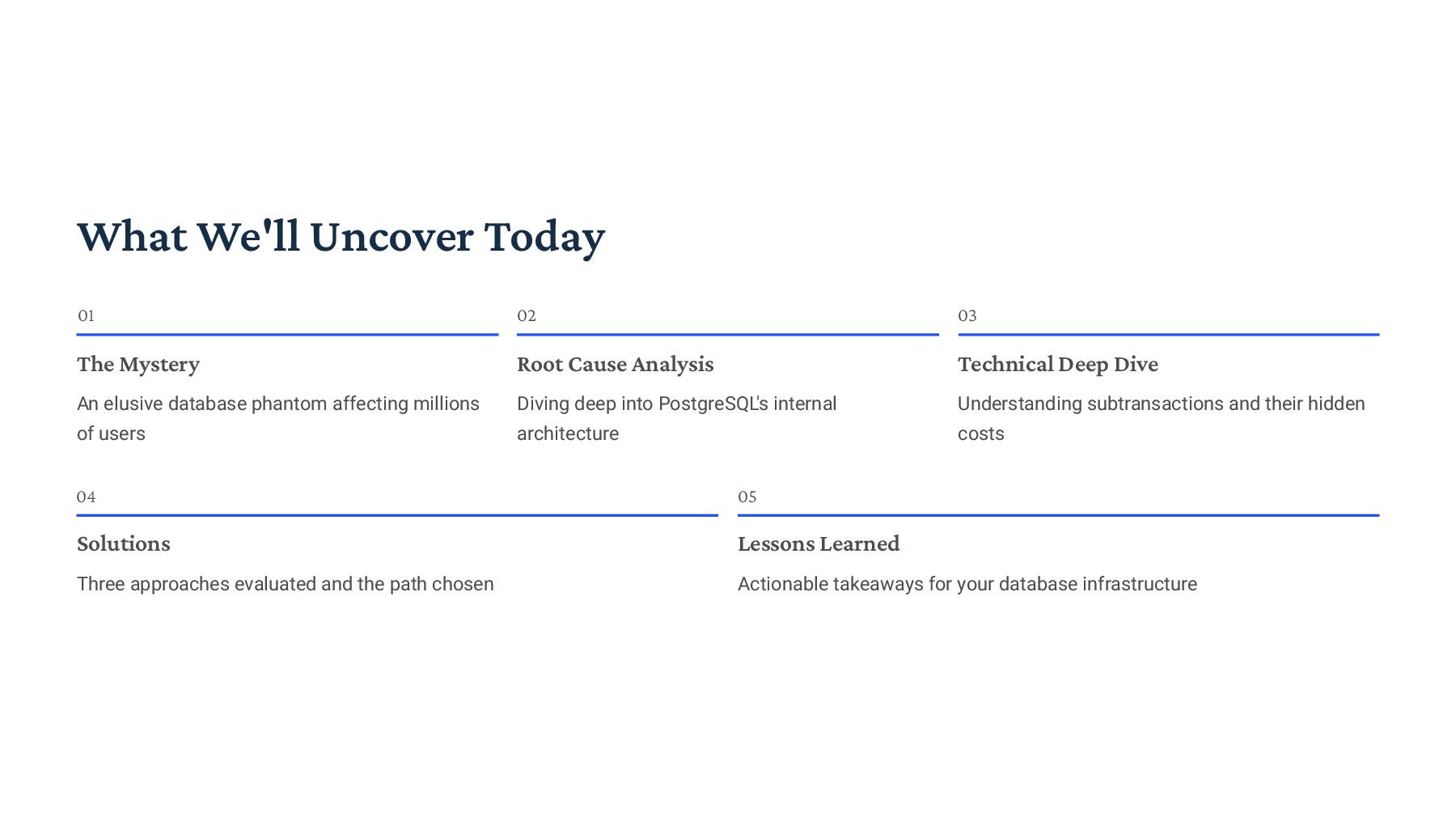 phantom affecting millions of users 02 Root Cause Analysis Diving deep into PostgreSQL's internal architecture 03 Technical Deep Dive Understanding subtransactions and their hidden costs 04 Solutions Three approaches evaluated and the path chosen 05 Lessons Learned Actionable takeaways for your database infrastructure