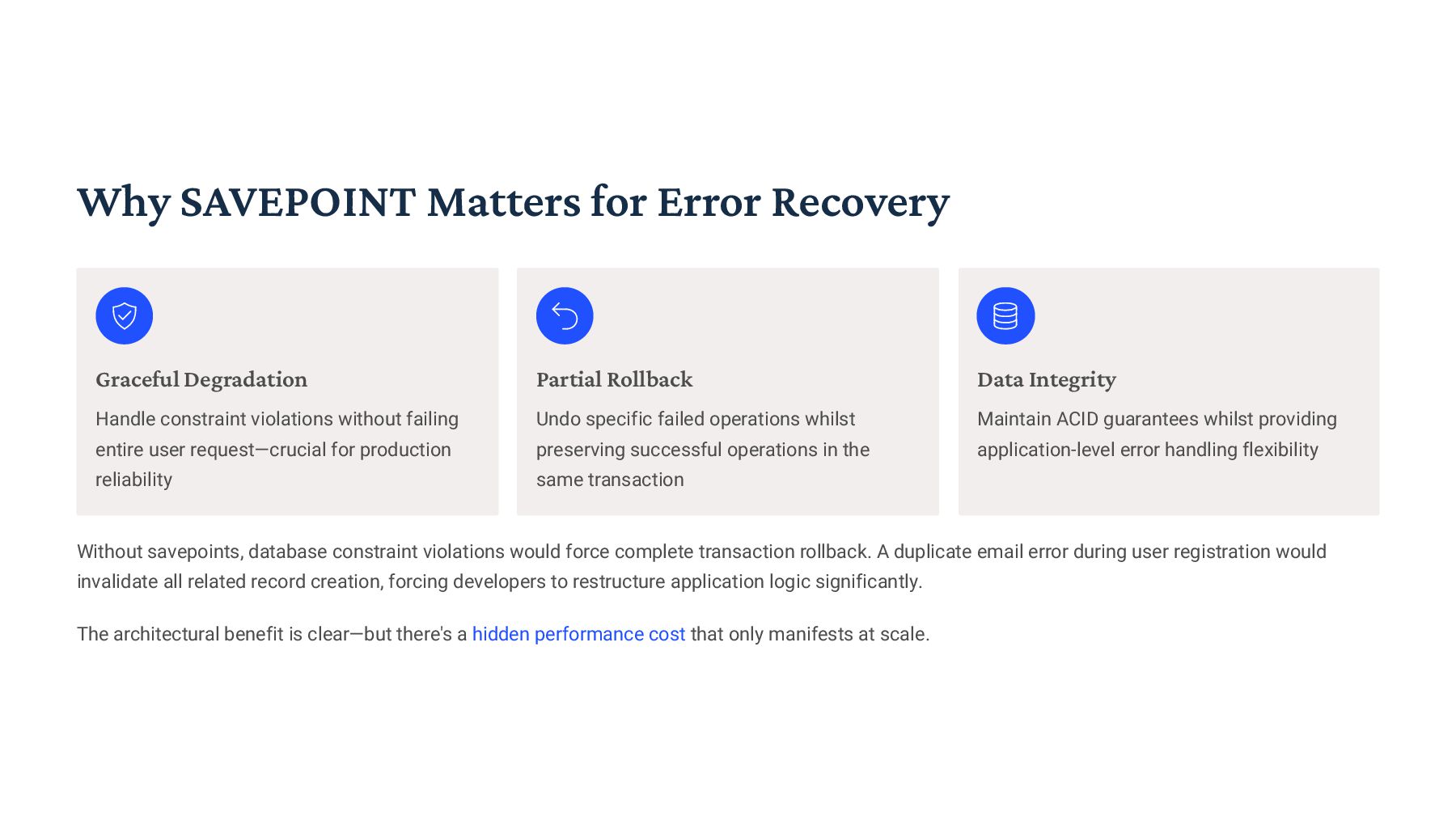 violations without failing entire user request4crucial for production reliability Partial Rollback Undo specific failed operations whilst preserving successful operations in the same transaction Data Integrity Maintain ACID guarantees whilst providing application-level error handling flexibility Without savepoints, database constraint violations would force complete transaction rollback. A duplicate email error during user registration would invalidate all related record creation, forcing developers to restructure application logic significantly. The architectural benefit is clear4but there's a hidden performance cost that only manifests at scale.