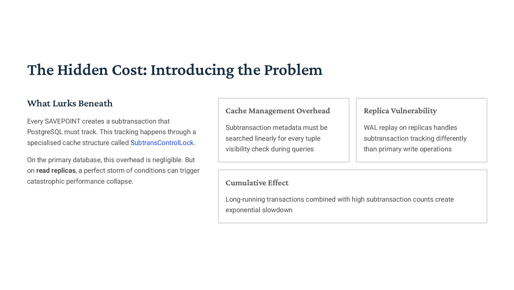 SAVEPOINT creates a subtransaction that PostgreSQL must track. This tracking happens through a specialised cache structure called SubtransControlLock. On the primary database, this overhead is negligible. But on read replicas, a perfect storm of conditions can trigger catastrophic performance collapse. Cache Management Overhead Subtransaction metadata must be searched linearly for every tuple visibility check during queries Replica Vulnerability WAL replay on replicas handles subtransaction tracking differently than primary write operations Cumulative Effect Long-running transactions combined with high subtransaction counts create exponential slowdown