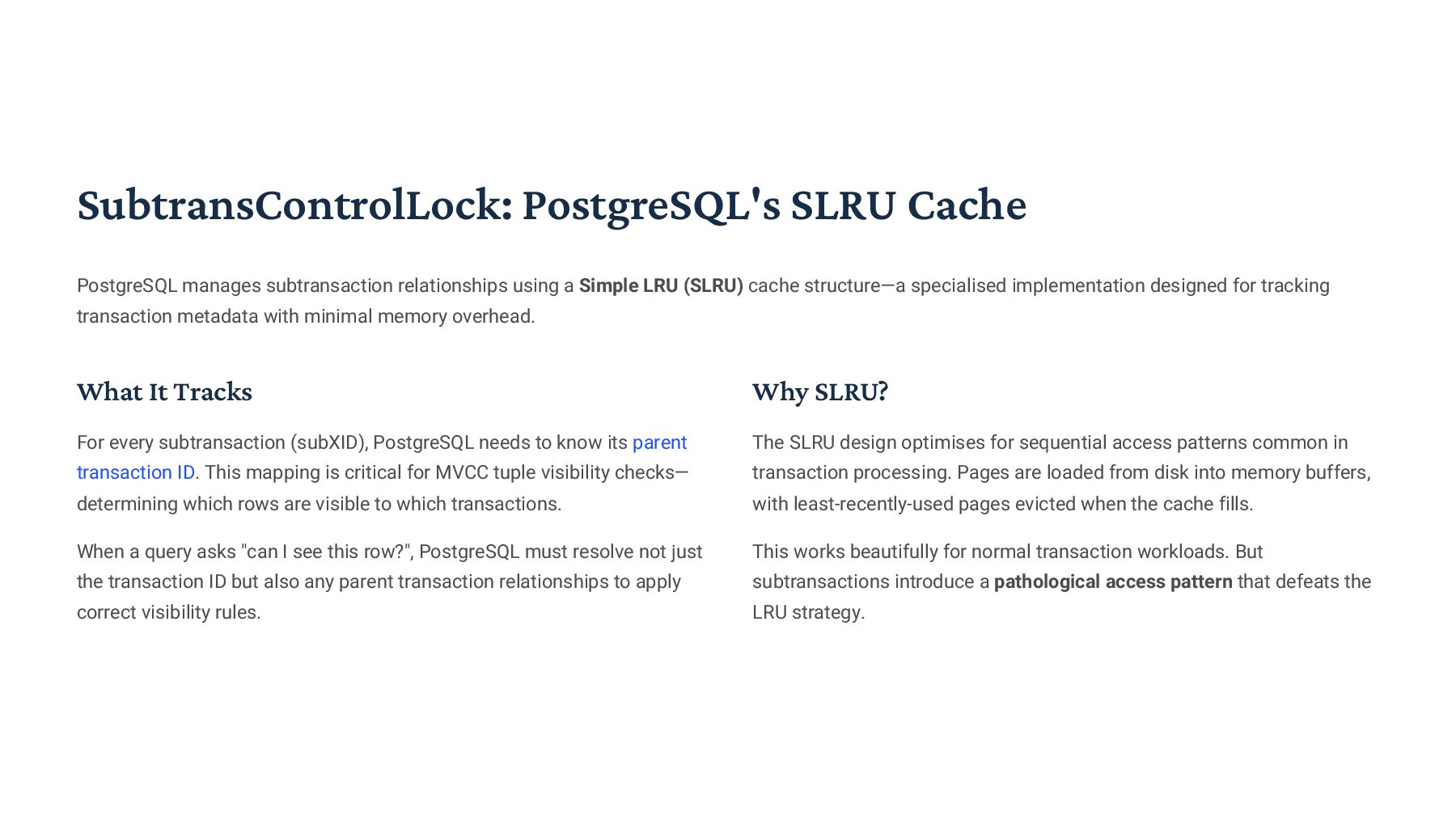 Simple LRU (SLRU) cache structure4a specialised implementation designed for tracking transaction metadata with minimal memory overhead. What It Tracks For every subtransaction (subXID), PostgreSQL needs to know its parent transaction ID. This mapping is critical for MVCC tuple visibility checks4 determining which rows are visible to which transactions. When a query asks "can I see this row?", PostgreSQL must resolve not just the transaction ID but also any parent transaction relationships to apply correct visibility rules. Why SLRU? The SLRU design optimises for sequential access patterns common in transaction processing. Pages are loaded from disk into memory buffers, with least-recently-used pages evicted when the cache fills. This works beautifully for normal transaction workloads. But subtransactions introduce a pathological access pattern that defeats the LRU strategy.