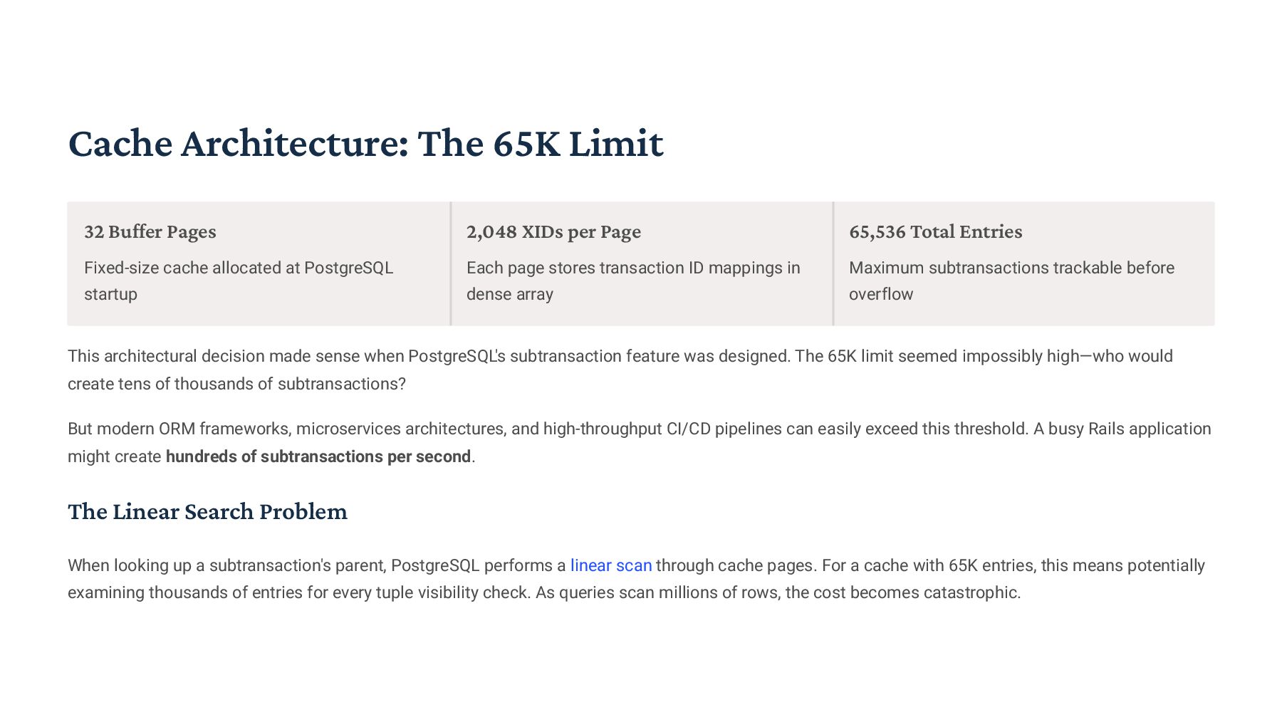 allocated at PostgreSQL startup 2,048 XIDs per Page Each page stores transaction ID mappings in dense array 65,536 Total Entries Maximum subtransactions trackable before overflow This architectural decision made sense when PostgreSQL's subtransaction feature was designed. The 65K limit seemed impossibly high4who would create tens of thousands of subtransactions? But modern ORM frameworks, microservices architectures, and high-throughput CI/CD pipelines can easily exceed this threshold. A busy Rails application might create hundreds of subtransactions per second. The Linear Search Problem When looking up a subtransaction's parent, PostgreSQL performs a linear scan through cache pages. For a cache with 65K entries, this means potentially examining thousands of entries for every tuple visibility check. As queries scan millions of rows, the cost becomes catastrophic.