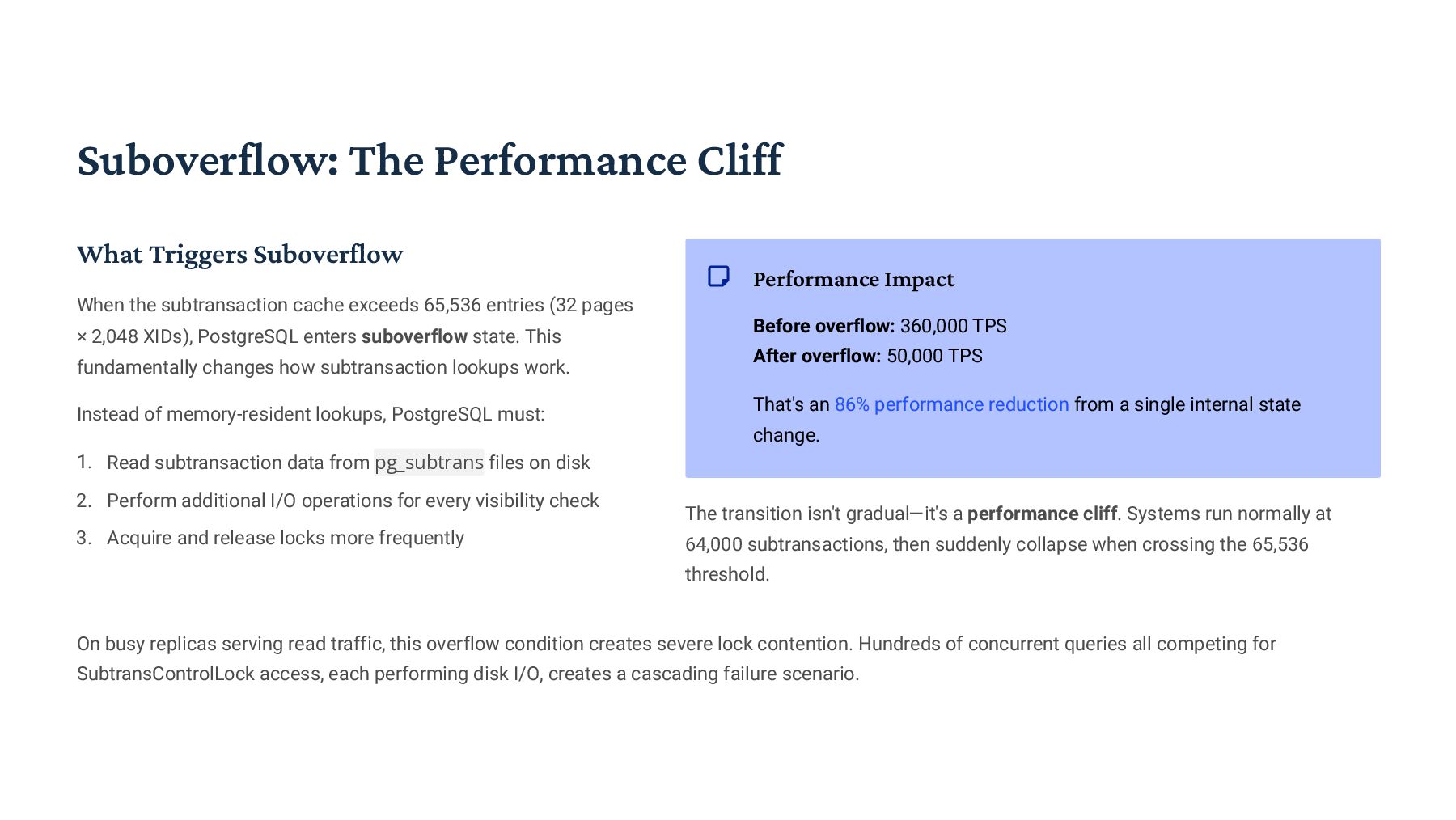 cache exceeds 65,536 entries (32 pages × 2,048 XIDs), PostgreSQL enters suboverflow state. This fundamentally changes how subtransaction lookups work. Instead of memory-resident lookups, PostgreSQL must: Read subtransaction data from pg_subtrans files on disk 1. Perform additional I/O operations for every visibility check 2. Acquire and release locks more frequently 3. Performance Impact Before overflow: 360,000 TPS After overflow: 50,000 TPS That's an 86% performance reduction from a single internal state change. The transition isn't gradual4it's a performance cliff. Systems run normally at 64,000 subtransactions, then suddenly collapse when crossing the 65,536 threshold. On busy replicas serving read traffic, this overflow condition creates severe lock contention. Hundreds of concurrent queries all competing for SubtransControlLock access, each performing disk I/O, creates a cascading failure scenario.