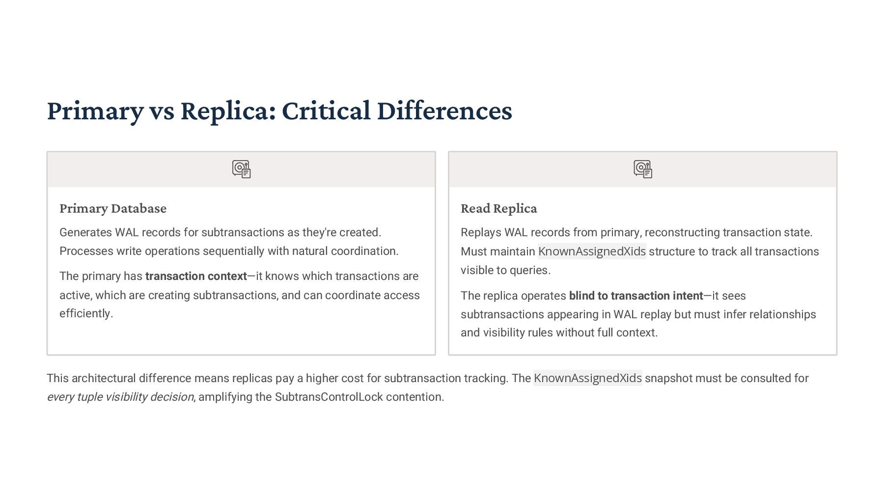 for subtransactions as they're created. Processes write operations sequentially with natural coordination. The primary has transaction context4it knows which transactions are active, which are creating subtransactions, and can coordinate access efficiently. Read Replica Replays WAL records from primary, reconstructing transaction state. Must maintain KnownAssignedXids structure to track all transactions visible to queries. The replica operates blind to transaction intent4it sees subtransactions appearing in WAL replay but must infer relationships and visibility rules without full context. This architectural difference means replicas pay a higher cost for subtransaction tracking. The KnownAssignedXids snapshot must be consulted for every tuple visibility decision, amplifying the SubtransControlLock contention.