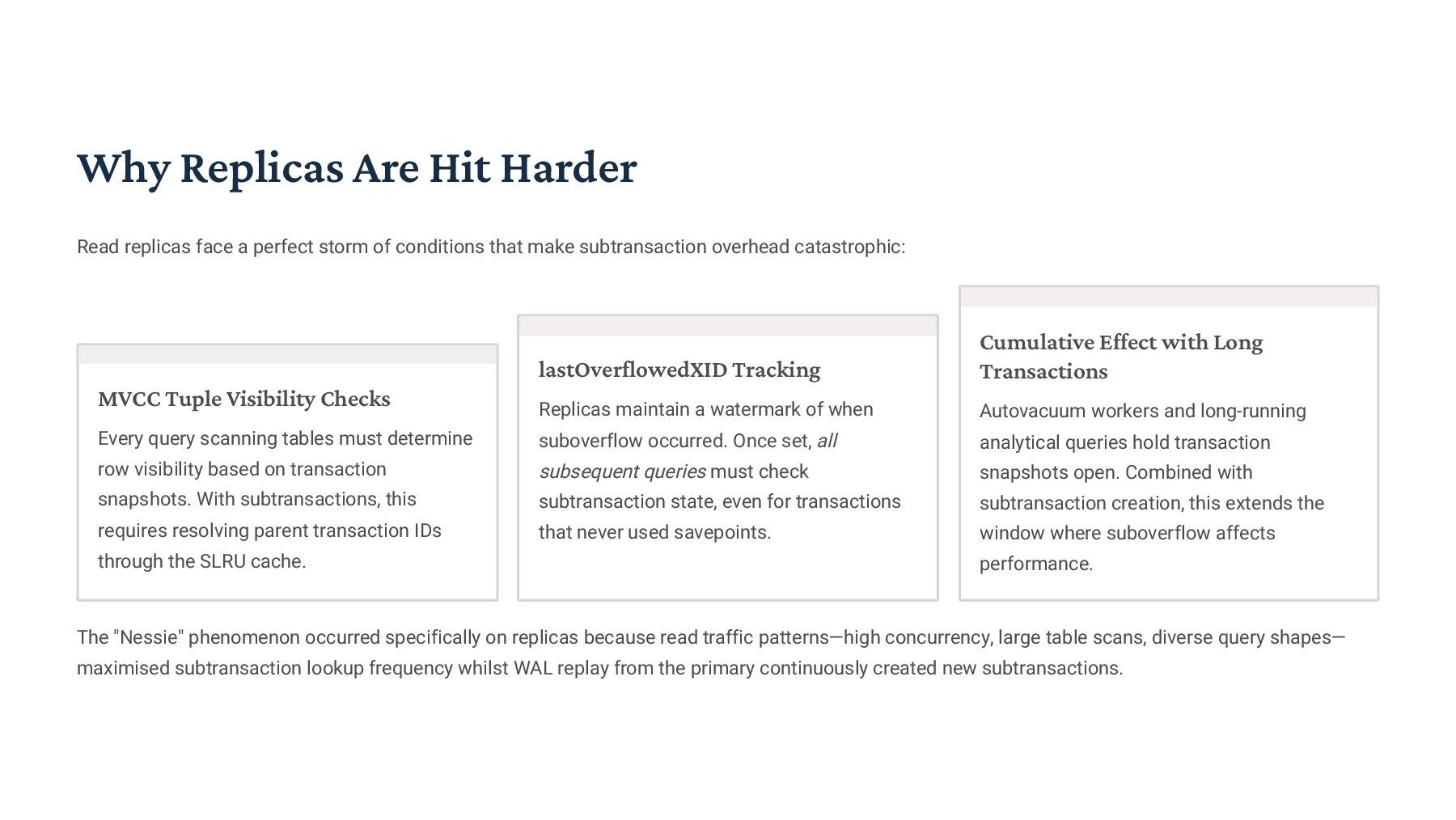 storm of conditions that make subtransaction overhead catastrophic: MVCC Tuple Visibility Checks Every query scanning tables must determine row visibility based on transaction snapshots. With subtransactions, this requires resolving parent transaction IDs through the SLRU cache. lastOverflowedXID Tracking Replicas maintain a watermark of when suboverflow occurred. Once set, all subsequent queries must check subtransaction state, even for transactions that never used savepoints. Cumulative Effect with Long Transactions Autovacuum workers and long-running analytical queries hold transaction snapshots open. Combined with subtransaction creation, this extends the window where suboverflow affects performance. The "Nessie" phenomenon occurred specifically on replicas because read traffic patterns4high concurrency, large table scans, diverse query shapes4 maximised subtransaction lookup frequency whilst WAL replay from the primary continuously created new subtransactions.