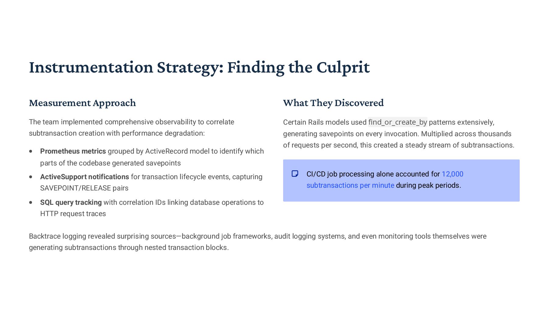 comprehensive observability to correlate subtransaction creation with performance degradation: Prometheus metrics grouped by ActiveRecord model to identify which parts of the codebase generated savepoints ActiveSupport notifications for transaction lifecycle events, capturing SAVEPOINT/RELEASE pairs SQL query tracking with correlation IDs linking database operations to HTTP request traces What They Discovered Certain Rails models used find_or_create_by patterns extensively, generating savepoints on every invocation. Multiplied across thousands of requests per second, this created a steady stream of subtransactions. CI/CD job processing alone accounted for 12,000 subtransactions per minute during peak periods. Backtrace logging revealed surprising sources4background job frameworks, audit logging systems, and even monitoring tools themselves were generating subtransactions through nested transaction blocks.