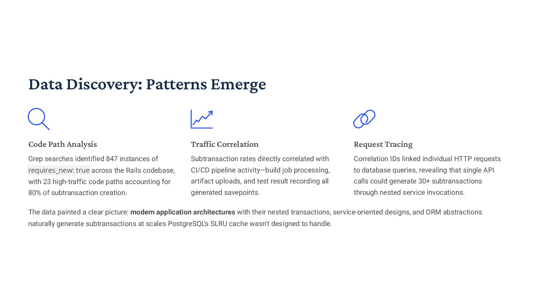 847 instances of requires_new: true across the Rails codebase, with 23 high-traffic code paths accounting for 80% of subtransaction creation. Traffic Correlation Subtransaction rates directly correlated with CI/CD pipeline activity4build job processing, artifact uploads, and test result recording all generated savepoints. Request Tracing Correlation IDs linked individual HTTP requests to database queries, revealing that single API calls could generate 30+ subtransactions through nested service invocations. The data painted a clear picture: modern application architectures with their nested transactions, service-oriented designs, and ORM abstractions naturally generate subtransactions at scales PostgreSQL's SLRU cache wasn't designed to handle.