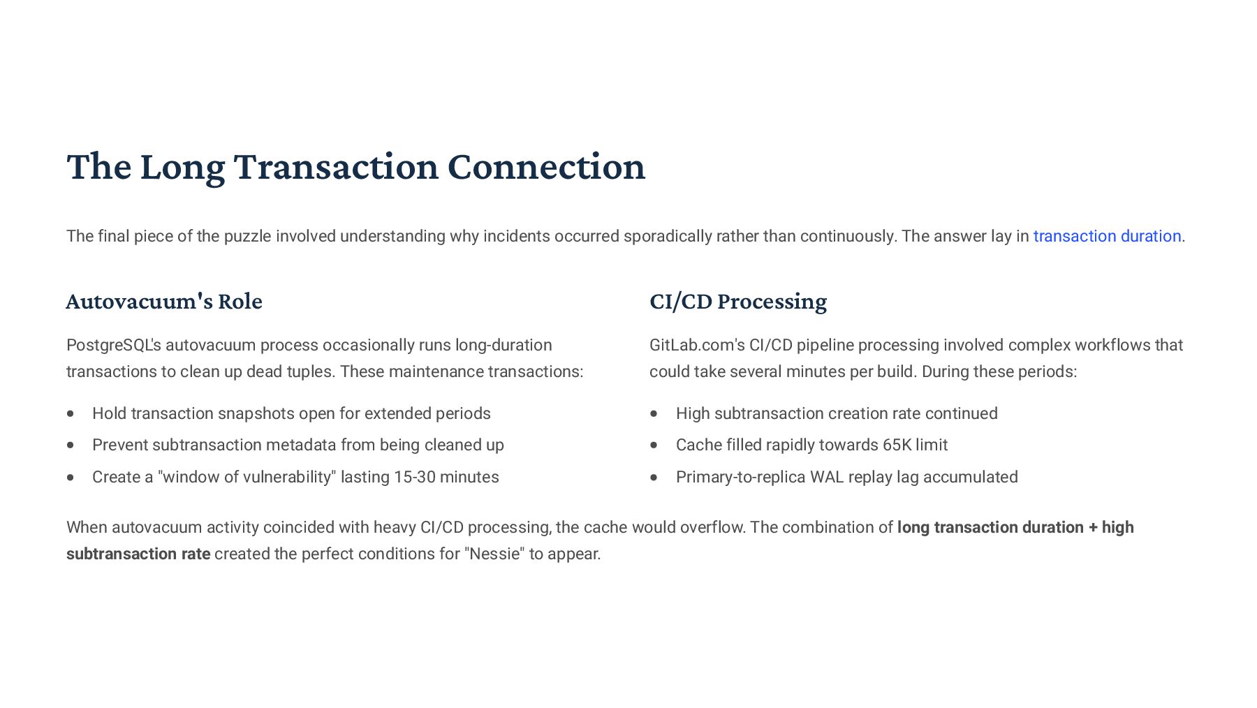 involved understanding why incidents occurred sporadically rather than continuously. The answer lay in transaction duration. Autovacuum's Role PostgreSQL's autovacuum process occasionally runs long-duration transactions to clean up dead tuples. These maintenance transactions: Hold transaction snapshots open for extended periods Prevent subtransaction metadata from being cleaned up Create a "window of vulnerability" lasting 15-30 minutes CI/CD Processing GitLab.com's CI/CD pipeline processing involved complex workflows that could take several minutes per build. During these periods: High subtransaction creation rate continued Cache filled rapidly towards 65K limit Primary-to-replica WAL replay lag accumulated When autovacuum activity coincided with heavy CI/CD processing, the cache would overflow. The combination of long transaction duration + high subtransaction rate created the perfect conditions for "Nessie" to appear.