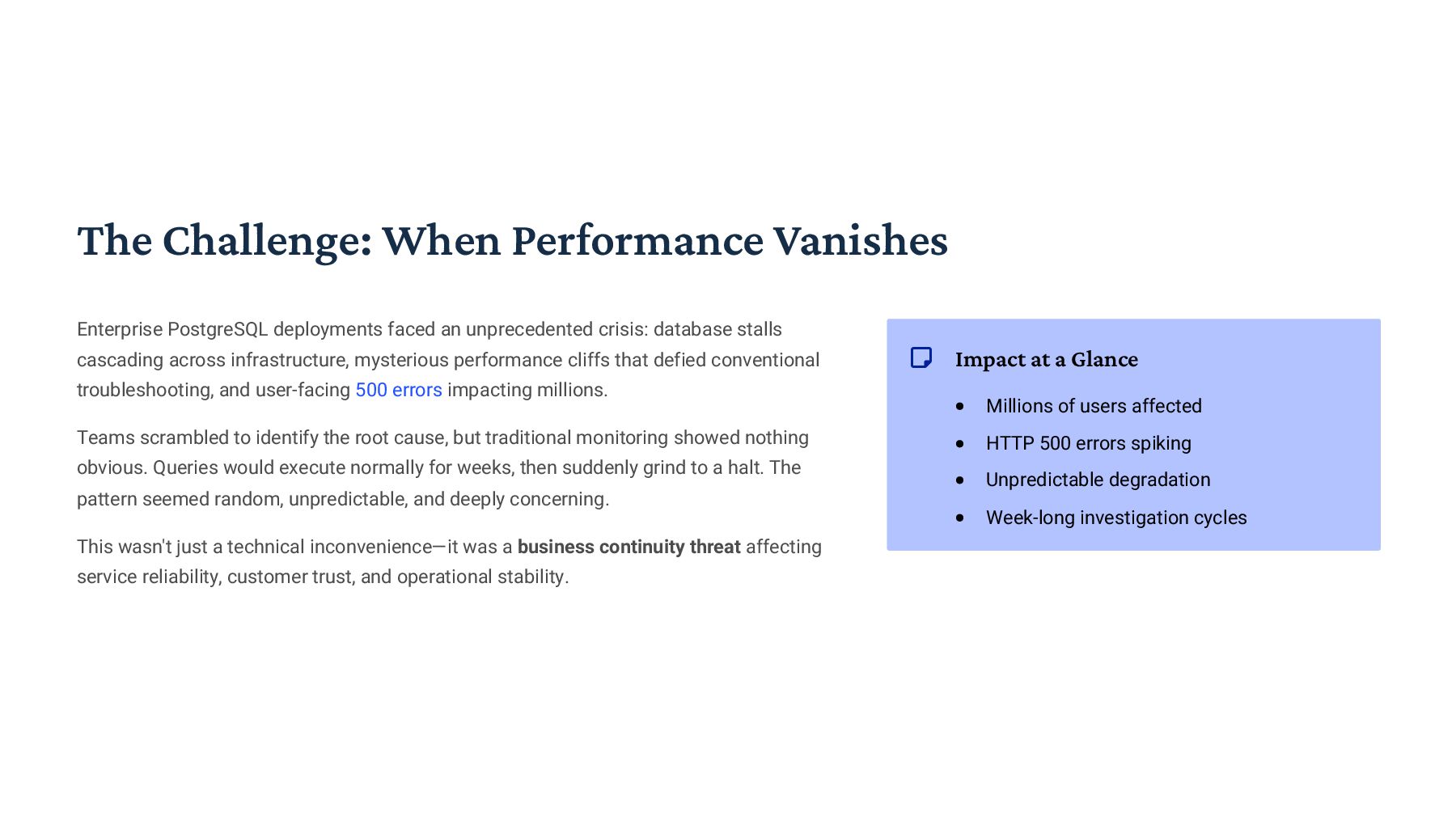 3. The Challenge: When Performance Vanishes Enterprise PostgreSQL deployments faced an