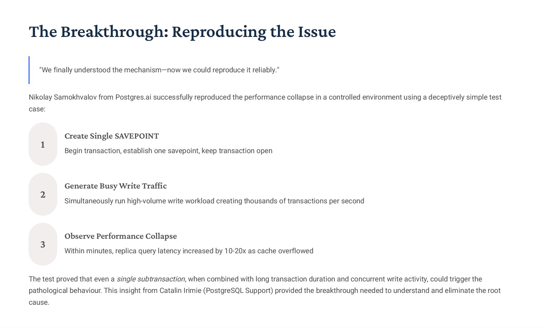 we could reproduce it reliably." Nikolay Samokhvalov from Postgres.ai successfully reproduced the performance collapse in a controlled environment using a deceptively simple test case: 1 Create Single SAVEPOINT Begin transaction, establish one savepoint, keep transaction open 2 Generate Busy Write Traffic Simultaneously run high-volume write workload creating thousands of transactions per second 3 Observe Performance Collapse Within minutes, replica query latency increased by 10-20x as cache overflowed The test proved that even a single subtransaction, when combined with long transaction duration and concurrent write activity, could trigger the pathological behaviour. This insight from Catalin Irimie (PostgreSQL Support) provided the breakthrough needed to understand and eliminate the root cause.