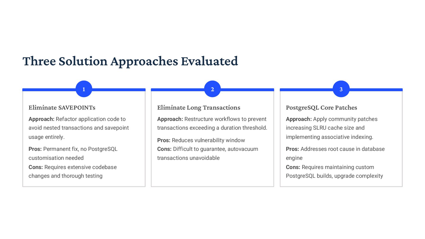 code to avoid nested transactions and savepoint usage entirely. Pros: Permanent fix, no PostgreSQL customisation needed Cons: Requires extensive codebase changes and thorough testing 2 Eliminate Long Transactions Approach: Restructure workflows to prevent transactions exceeding a duration threshold. Pros: Reduces vulnerability window Cons: Difficult to guarantee, autovacuum transactions unavoidable 3 PostgreSQL Core Patches Approach: Apply community patches increasing SLRU cache size and implementing associative indexing. Pros: Addresses root cause in database engine Cons: Requires maintaining custom PostgreSQL builds, upgrade complexity