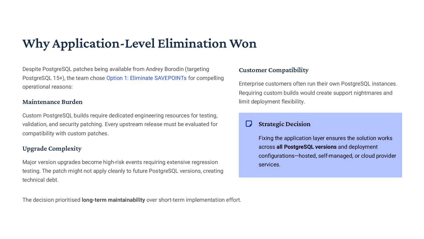 Andrey Borodin (targeting PostgreSQL 15+), the team chose Option 1: Eliminate SAVEPOINTs for compelling operational reasons: Maintenance Burden Custom PostgreSQL builds require dedicated engineering resources for testing, validation, and security patching. Every upstream release must be evaluated for compatibility with custom patches. Upgrade Complexity Major version upgrades become high-risk events requiring extensive regression testing. The patch might not apply cleanly to future PostgreSQL versions, creating technical debt. Customer Compatibility Enterprise customers often run their own PostgreSQL instances. Requiring custom builds would create support nightmares and limit deployment flexibility. Strategic Decision Fixing the application layer ensures the solution works across all PostgreSQL versions and deployment configurations4hosted, self-managed, or cloud provider services. The decision prioritised long-term maintainability over short-term implementation effort.