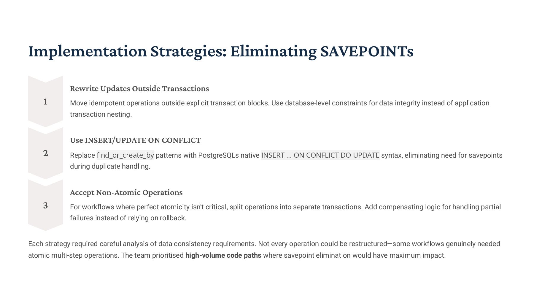 idempotent operations outside explicit transaction blocks. Use database-level constraints for data integrity instead of application transaction nesting. 2 Use INSERT/UPDATE ON CONFLICT Replace find_or_create_by patterns with PostgreSQL's native INSERT ... ON CONFLICT DO UPDATE syntax, eliminating need for savepoints during duplicate handling. 3 Accept Non-Atomic Operations For workflows where perfect atomicity isn't critical, split operations into separate transactions. Add compensating logic for handling partial failures instead of relying on rollback. Each strategy required careful analysis of data consistency requirements. Not every operation could be restructured4some workflows genuinely needed atomic multi-step operations. The team prioritised high-volume code paths where savepoint elimination would have maximum impact.