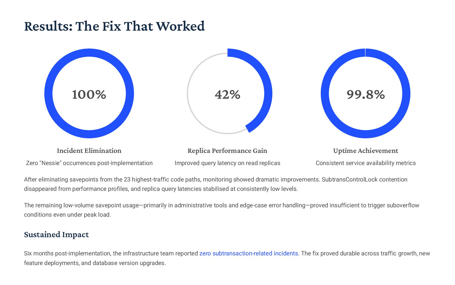 occurrences post-implementation 42% Replica Performance Gain Improved query latency on read replicas 99.8% Uptime Achievement Consistent service availability metrics After eliminating savepoints from the 23 highest-traffic code paths, monitoring showed dramatic improvements. SubtransControlLock contention disappeared from performance profiles, and replica query latencies stabilised at consistently low levels. The remaining low-volume savepoint usage4primarily in administrative tools and edge-case error handling4proved insufficient to trigger suboverflow conditions even under peak load. Sustained Impact Six months post-implementation, the infrastructure team reported zero subtransaction-related incidents. The fix proved durable across traffic growth, new feature deployments, and database version upgrades.