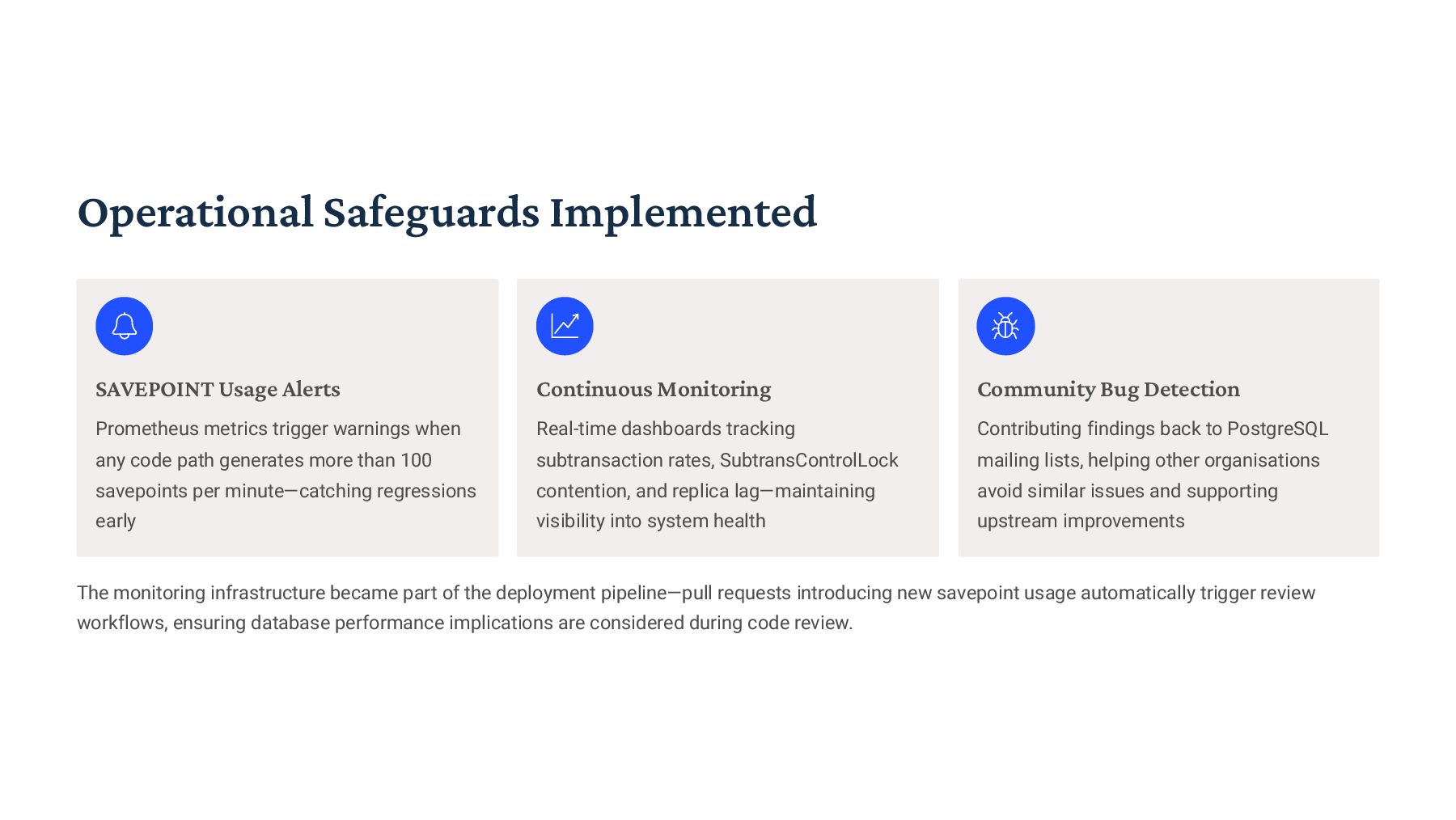 when any code path generates more than 100 savepoints per minute4catching regressions early Continuous Monitoring Real-time dashboards tracking subtransaction rates, SubtransControlLock contention, and replica lag4maintaining visibility into system health Community Bug Detection Contributing findings back to PostgreSQL mailing lists, helping other organisations avoid similar issues and supporting upstream improvements The monitoring infrastructure became part of the deployment pipeline4pull requests introducing new savepoint usage automatically trigger review workflows, ensuring database performance implications are considered during code review.