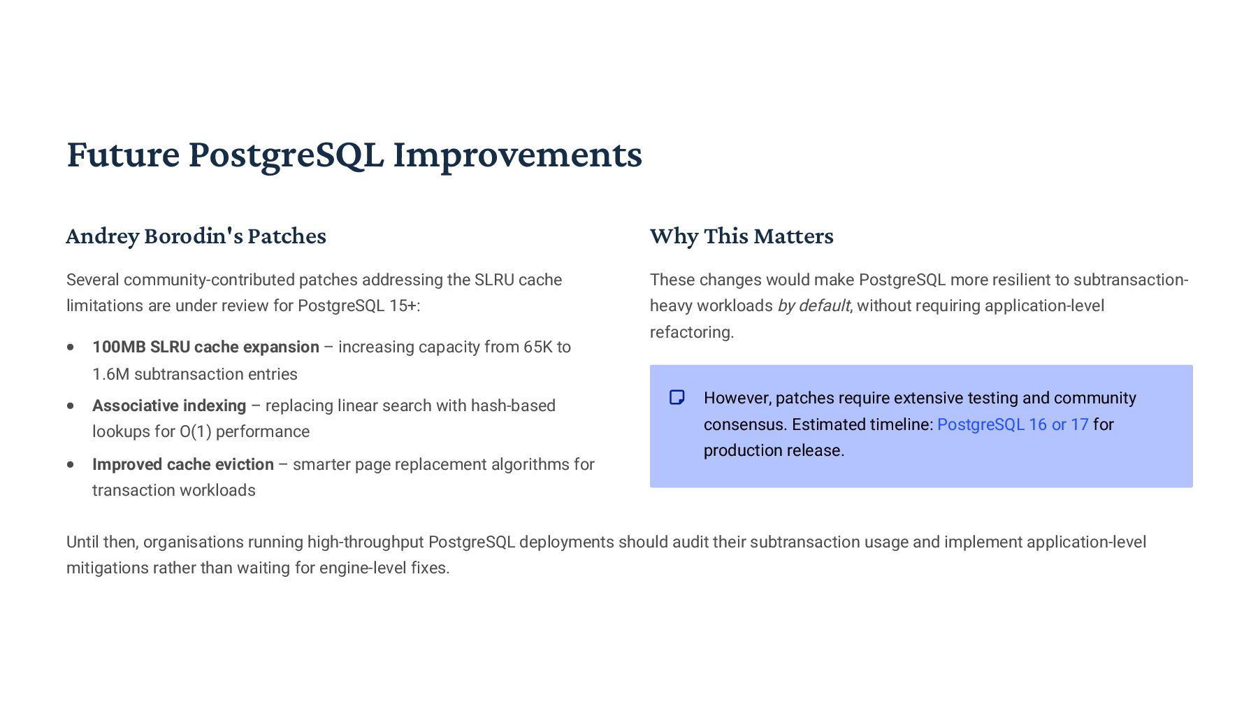 the SLRU cache limitations are under review for PostgreSQL 15+: 100MB SLRU cache expansion 3 increasing capacity from 65K to 1.6M subtransaction entries Associative indexing 3 replacing linear search with hash-based lookups for O(1) performance Improved cache eviction 3 smarter page replacement algorithms for transaction workloads Why This Matters These changes would make PostgreSQL more resilient to subtransaction- heavy workloads by default, without requiring application-level refactoring. However, patches require extensive testing and community consensus. Estimated timeline: PostgreSQL 16 or 17 for production release. Until then, organisations running high-throughput PostgreSQL deployments should audit their subtransaction usage and implement application-level mitigations rather than waiting for engine-level fixes.