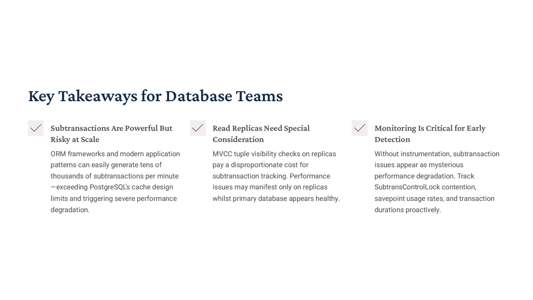 at Scale ORM frameworks and modern application patterns can easily generate tens of thousands of subtransactions per minute 4exceeding PostgreSQL's cache design limits and triggering severe performance degradation. Read Replicas Need Special Consideration MVCC tuple visibility checks on replicas pay a disproportionate cost for subtransaction tracking. Performance issues may manifest only on replicas whilst primary database appears healthy. Monitoring Is Critical for Early Detection Without instrumentation, subtransaction issues appear as mysterious performance degradation. Track SubtransControlLock contention, savepoint usage rates, and transaction durations proactively.