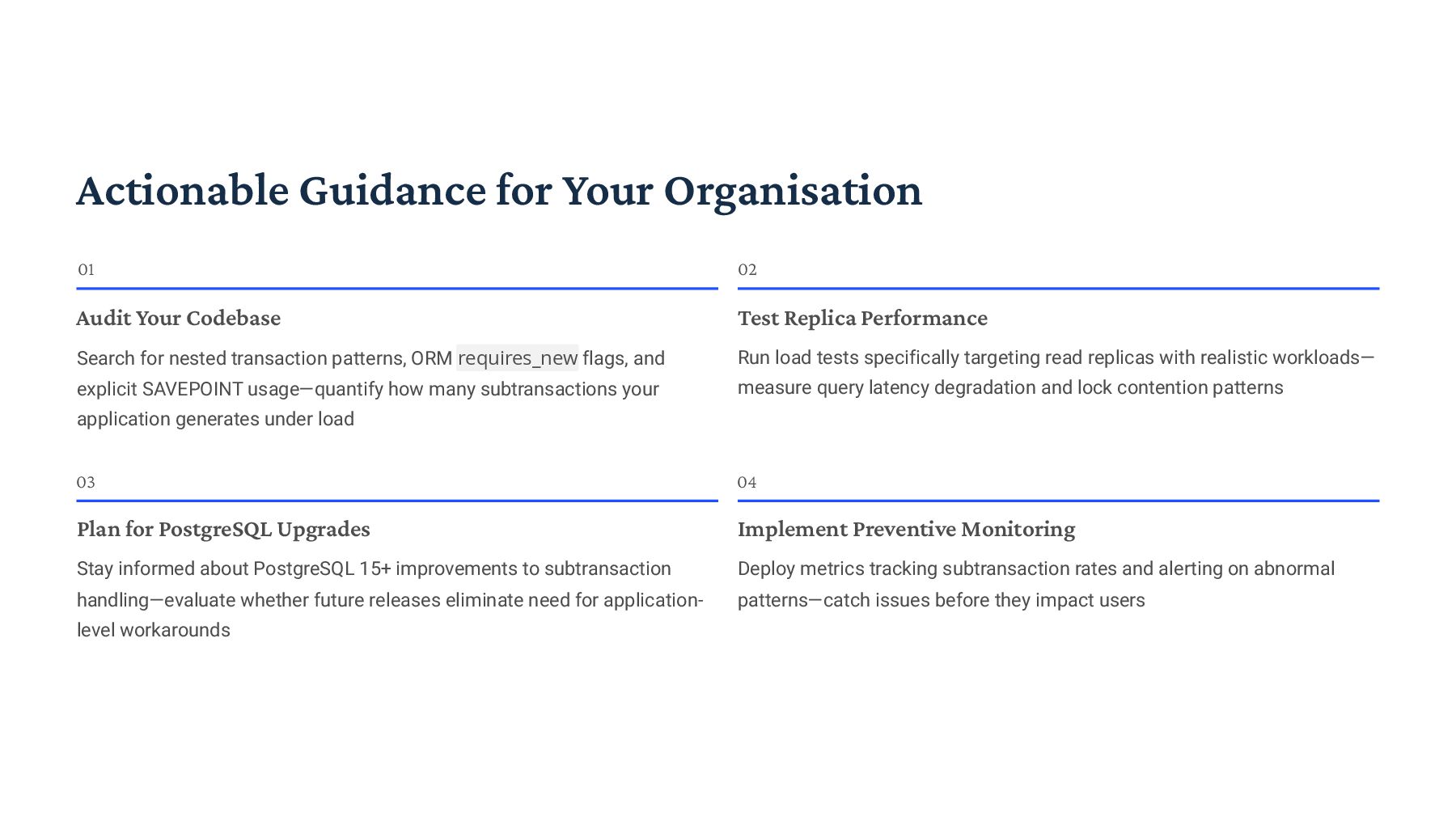for nested transaction patterns, ORM requires_new flags, and explicit SAVEPOINT usage4quantify how many subtransactions your application generates under load 02 Test Replica Performance Run load tests specifically targeting read replicas with realistic workloads4 measure query latency degradation and lock contention patterns 03 Plan for PostgreSQL Upgrades Stay informed about PostgreSQL 15+ improvements to subtransaction handling4evaluate whether future releases eliminate need for application- level workarounds 04 Implement Preventive Monitoring Deploy metrics tracking subtransaction rates and alerting on abnormal patterns4catch issues before they impact users