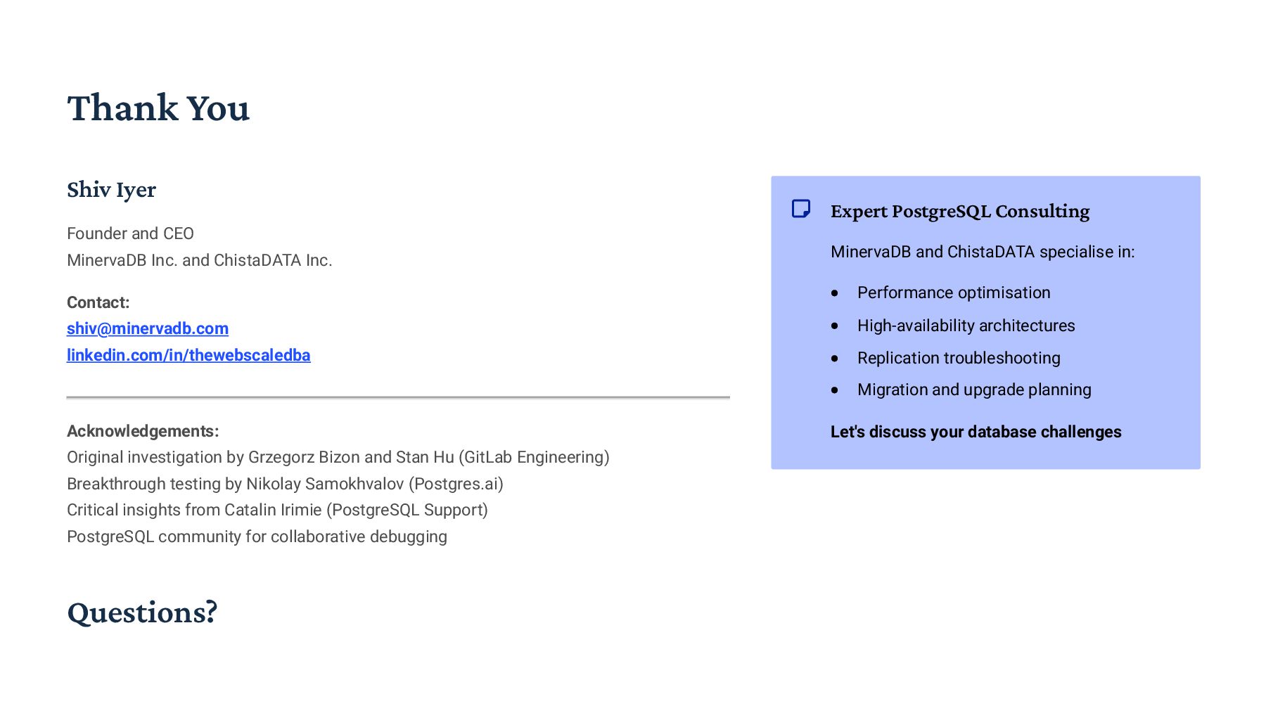 ChistaDATA Inc. Contact: [email protected] linkedin.com/in/thewebscaledba Acknowledgements: Original investigation by Grzegorz Bizon and Stan Hu (GitLab Engineering) Breakthrough testing by Nikolay Samokhvalov (Postgres.ai) Critical insights from Catalin Irimie (PostgreSQL Support) PostgreSQL community for collaborative debugging Expert PostgreSQL Consulting MinervaDB and ChistaDATA specialise in: Performance optimisation High-availability architectures Replication troubleshooting Migration and upgrade planning Let's discuss your database challenges Questions?