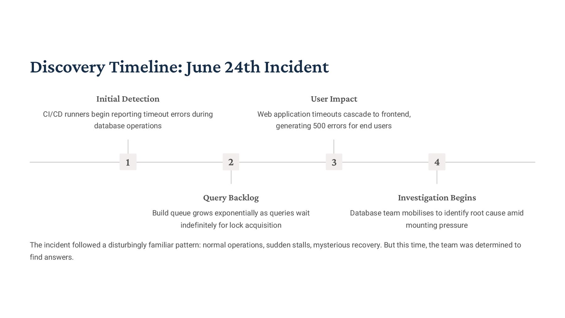 begin reporting timeout errors during database operations 2 Query Backlog Build queue grows exponentially as queries wait indefinitely for lock acquisition 3 User Impact Web application timeouts cascade to frontend, generating 500 errors for end users 4 Investigation Begins Database team mobilises to identify root cause amid mounting pressure The incident followed a disturbingly familiar pattern: normal operations, sudden stalls, mysterious recovery. But this time, the team was determined to find answers.