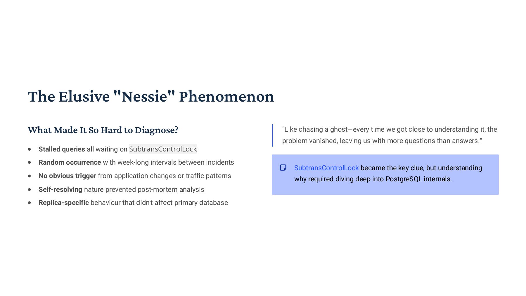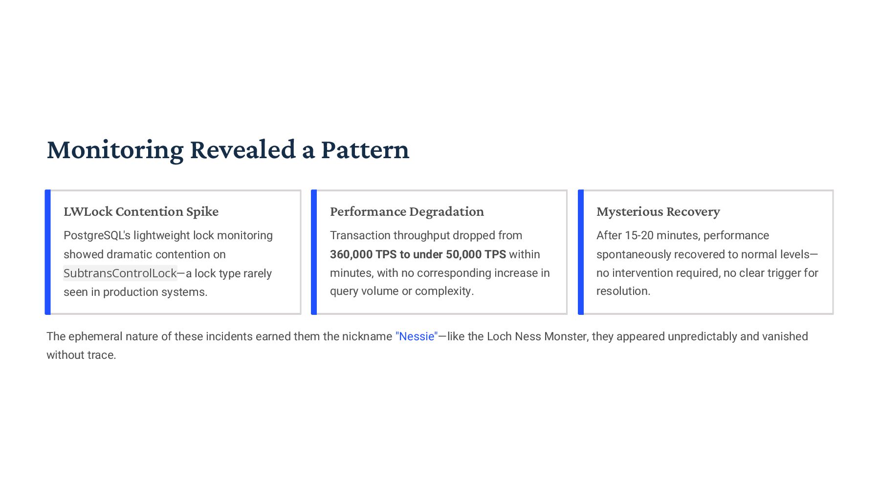 monitoring showed dramatic contention on SubtransControlLock4a lock type rarely seen in production systems. Performance Degradation Transaction throughput dropped from 360,000 TPS to under 50,000 TPS within minutes, with no corresponding increase in query volume or complexity. Mysterious Recovery After 15-20 minutes, performance spontaneously recovered to normal levels4 no intervention required, no clear trigger for resolution. The ephemeral nature of these incidents earned them the nickname "Nessie"4like the Loch Ness Monster, they appeared unpredictably and vanished without trace.
