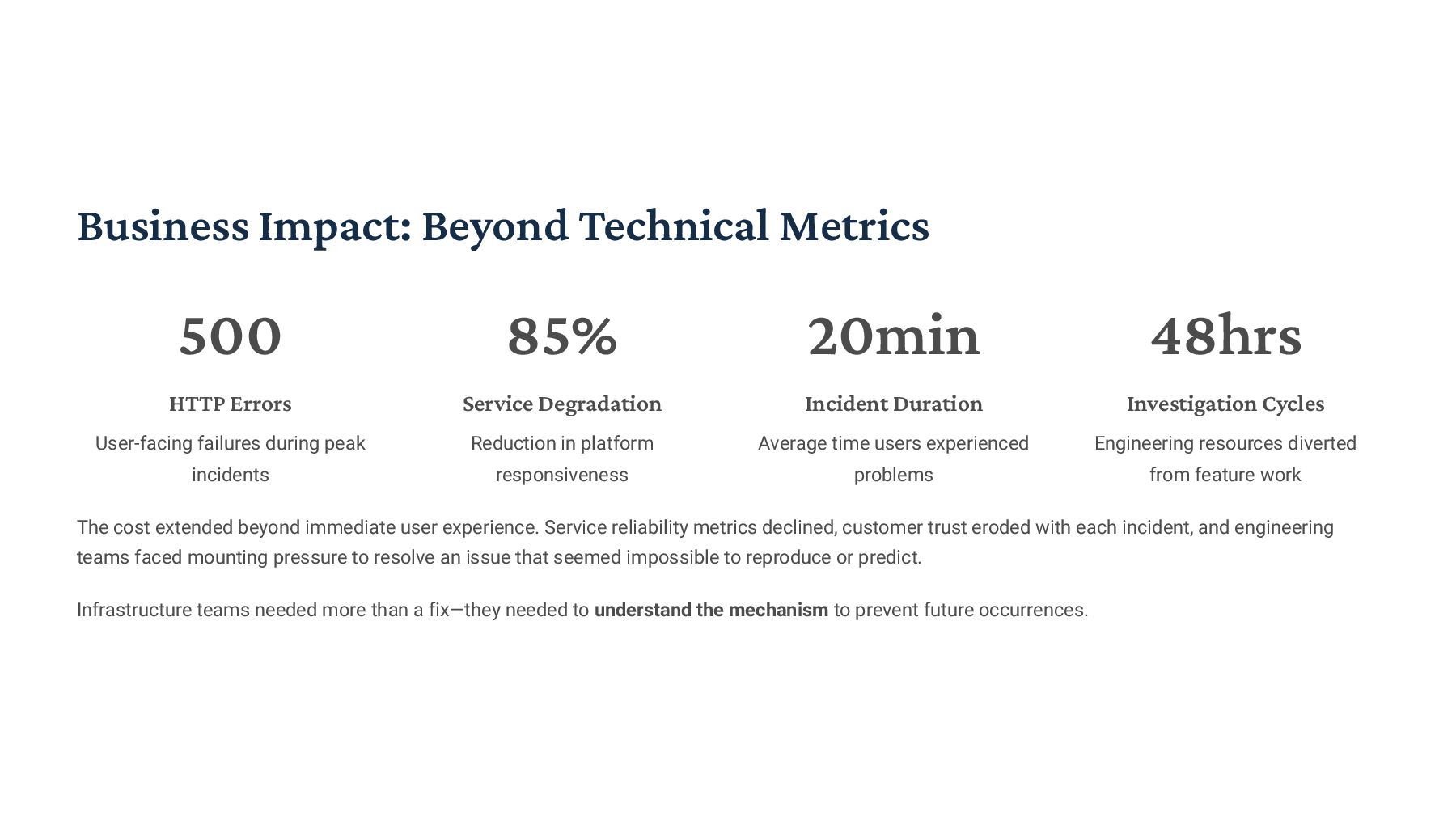 during peak incidents 85% Service Degradation Reduction in platform responsiveness 20min Incident Duration Average time users experienced problems 48hrs Investigation Cycles Engineering resources diverted from feature work The cost extended beyond immediate user experience. Service reliability metrics declined, customer trust eroded with each incident, and engineering teams faced mounting pressure to resolve an issue that seemed impossible to reproduce or predict. Infrastructure teams needed more than a fix4they needed to understand the mechanism to prevent future occurrences.
