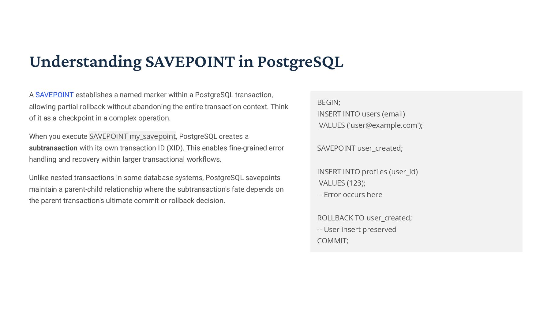 within a PostgreSQL transaction, allowing partial rollback without abandoning the entire transaction context. Think of it as a checkpoint in a complex operation. When you execute SAVEPOINT my_savepoint, PostgreSQL creates a subtransaction with its own transaction ID (XID). This enables fine-grained error handling and recovery within larger transactional workflows. Unlike nested transactions in some database systems, PostgreSQL savepoints maintain a parent-child relationship where the subtransaction's fate depends on the parent transaction's ultimate commit or rollback decision. BEGIN; INSERT INTO users (email) VALUES ('[email protected]'); SAVEPOINT user_created; INSERT INTO profiles (user_id) VALUES (123); -- Error occurs here ROLLBACK TO user_created; -- User insert preserved COMMIT;