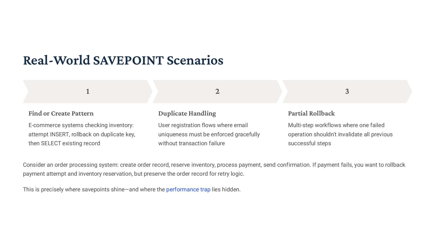 checking inventory: attempt INSERT, rollback on duplicate key, then SELECT existing record 2 Duplicate Handling User registration flows where email uniqueness must be enforced gracefully without transaction failure 3 Partial Rollback Multi-step workflows where one failed operation shouldn't invalidate all previous successful steps Consider an order processing system: create order record, reserve inventory, process payment, send confirmation. If payment fails, you want to rollback payment attempt and inventory reservation, but preserve the order record for retry logic. This is precisely where savepoints shine4and where the performance trap lies hidden.