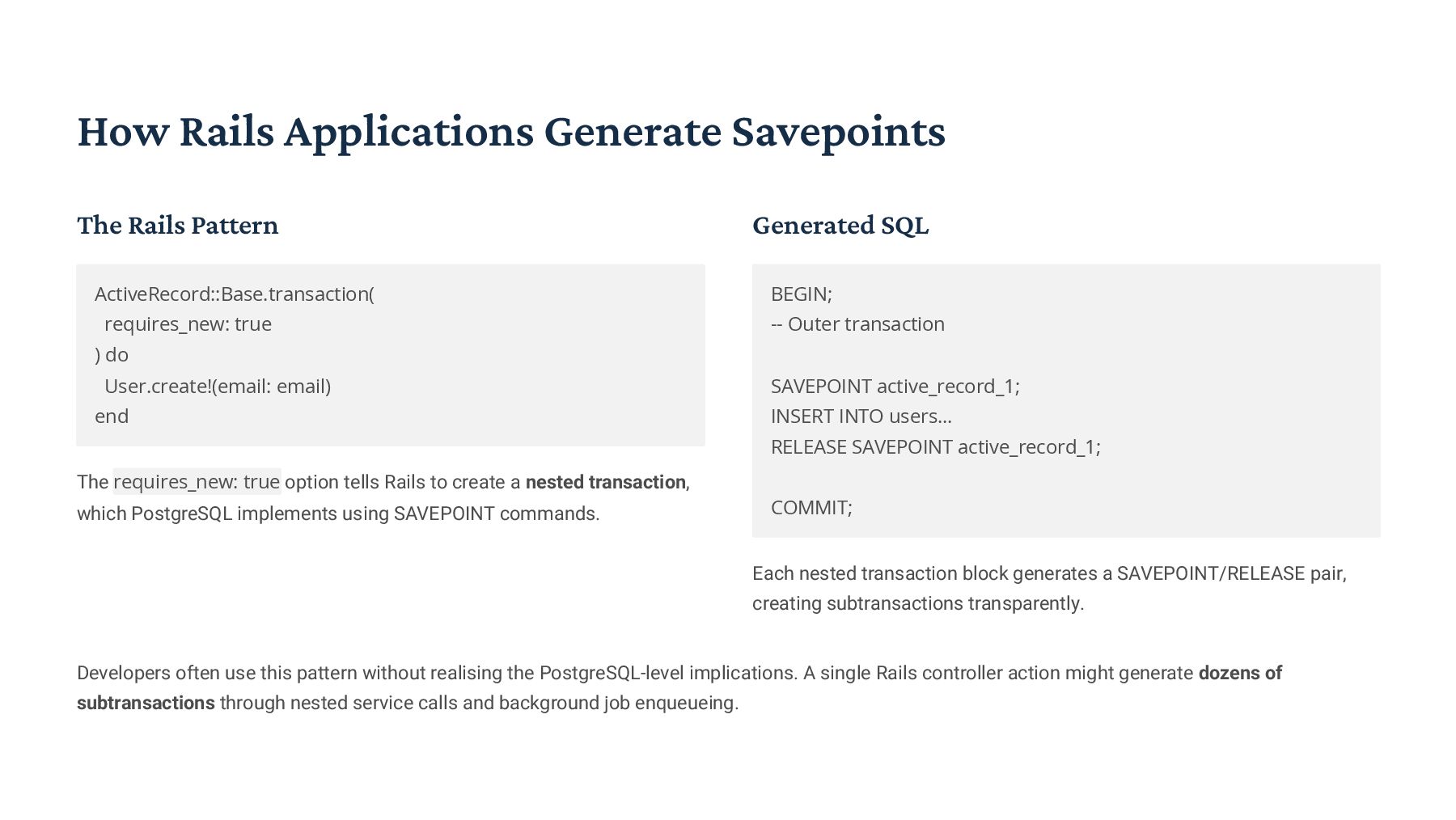 User.create!(email: email) end The Rails Pattern The requires_new: true option tells Rails to create a nested transaction, which PostgreSQL implements using SAVEPOINT commands. BEGIN; -- Outer transaction SAVEPOINT active_record_1; INSERT INTO users... RELEASE SAVEPOINT active_record_1; COMMIT; Generated SQL Each nested transaction block generates a SAVEPOINT/RELEASE pair, creating subtransactions transparently. Developers often use this pattern without realising the PostgreSQL-level implications. A single Rails controller action might generate dozens of subtransactions through nested service calls and background job enqueueing.