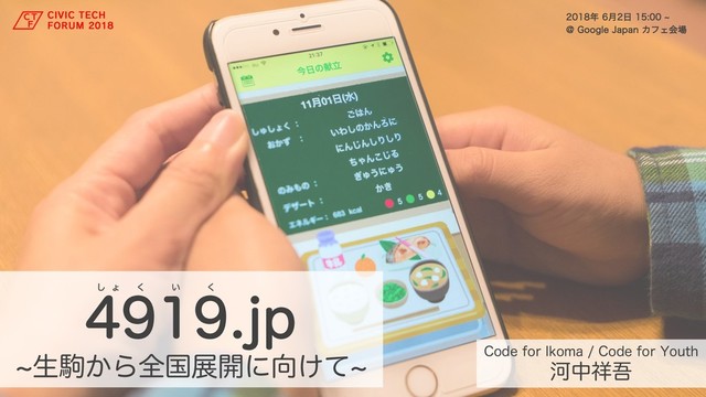 6月2日に開催されたCivicTechForum2018にて発表したスライドです。 イベント詳細はこちらのURLから http://2018.civictechforum.jp/ 4919.jpについてはこちらのURLから http://4919.jp/ ご確認いただけます。