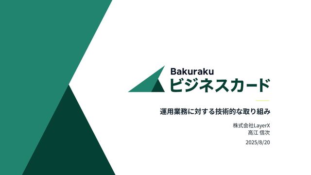 バクラク事業部 Payment開発部 部⻑ LayerX • 株式会社LayerXにてバクラク事業の⽴ち上げから参画し、当初はインフラの 開発‧運⽤に従事 • EM兼TechLeadとして2022年にリリースしたバクラクビジネスカードの開発を リードし、現在はバクラクの決済事業をさらに拡⼤させるために発⾜した Payment開発部の部⻑を担当 • LayerX のカルチャーを体現するチームづくりを⽬指してマネジメントに 励みつつ、⾃らもプレイヤーであり続けるために⽇々奮闘しています 経歴 • ソニー株式会社(R&D) → ソニーコンピュータサイエンス研究所(CSL) → ソニー‧グローバルエデュケーション → フリーランス → LayerX @shnjtk