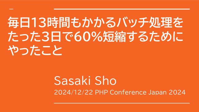 毎日13時間もかかるバッチ処理を たった3日で60%短縮するために やったこと Sasaki Sho 2024/12/22 PHP Conference Japan 2024