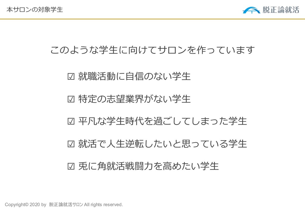 Copyright© 2020 by 脱正論就活サロン All rights reserved. 本サロンの対象学⽣ このような学⽣に向けてサロンを作っています ☑