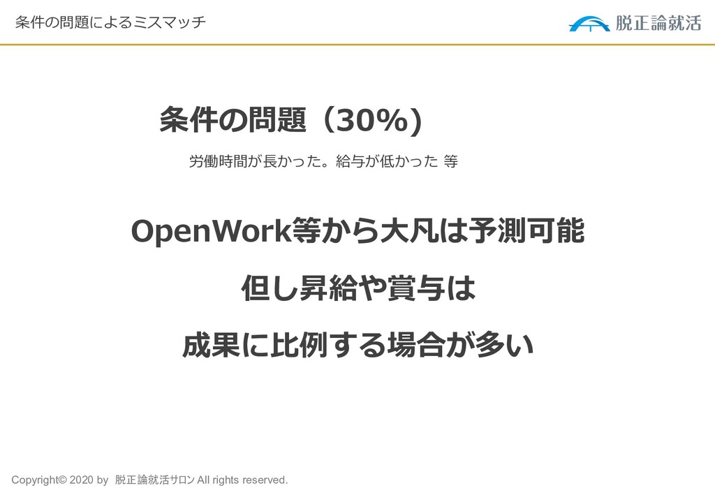 Copyright© 2020 by 脱正論就活サロン All rights reserved. 条件の問題(30%) 労働時間が⻑かった。給与が低かった 等