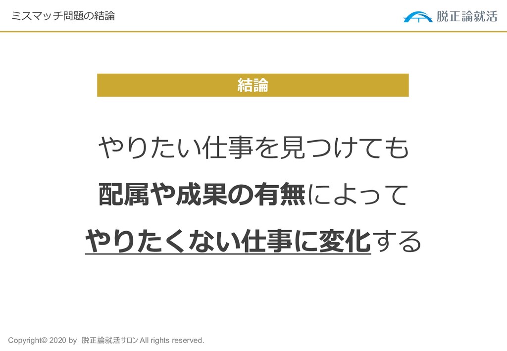 Copyright© 2020 by 脱正論就活サロン All rights reserved. やりたい仕事を⾒つけても 配属や成果の有無によって やりたくない仕事に変化する