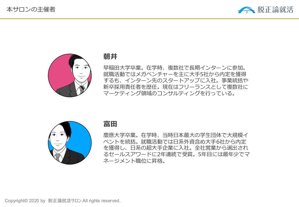 Copyright© 2020 by 脱正論就活サロン All rights reserved. 本サロンの主催者 早稲⽥⼤学卒業。在学時、複数社で⻑期インターンに参加。 就職活動ではメガベンチャーを主に⼤⼿5社から内定を獲得