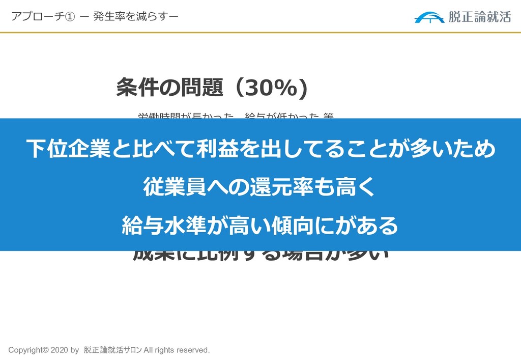 OpenWork等から⼤凡は予測可能 但し昇給や賞与は 成果に⽐例する場合が多い アプローチ① ー 発⽣率を減らすー 下位企業と⽐べて利益を出してることが多いため 従業員への還元率も⾼く 給与⽔準が⾼い傾向にがある