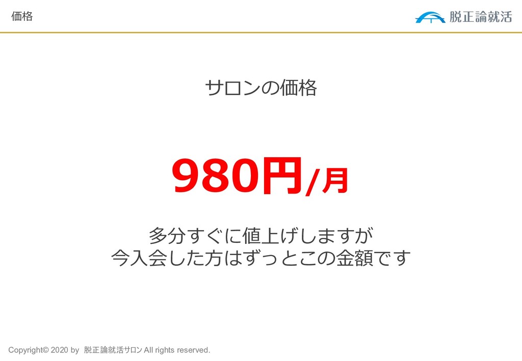 Copyright© 2020 by 脱正論就活サロン All rights reserved. 価格 サロンの価格 980円/⽉