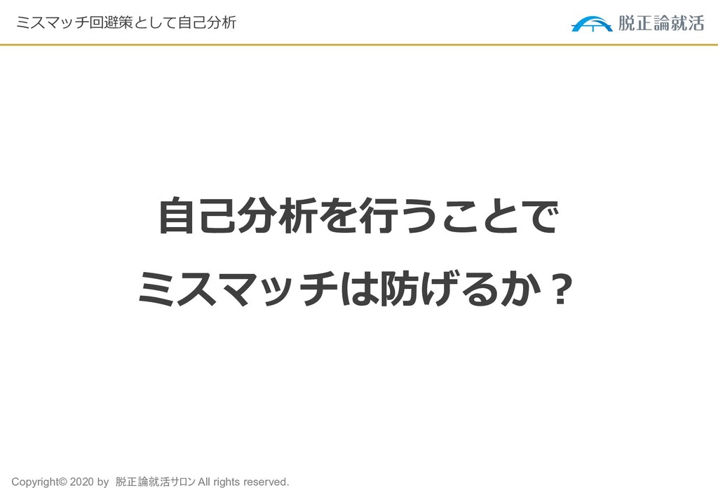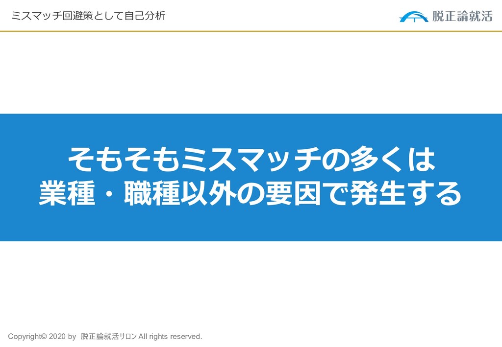Copyright© 2020 by 脱正論就活サロン All rights reserved. ミスマッチ回避策として⾃⼰分析 答えは否 そもそもミスマッチの多くは