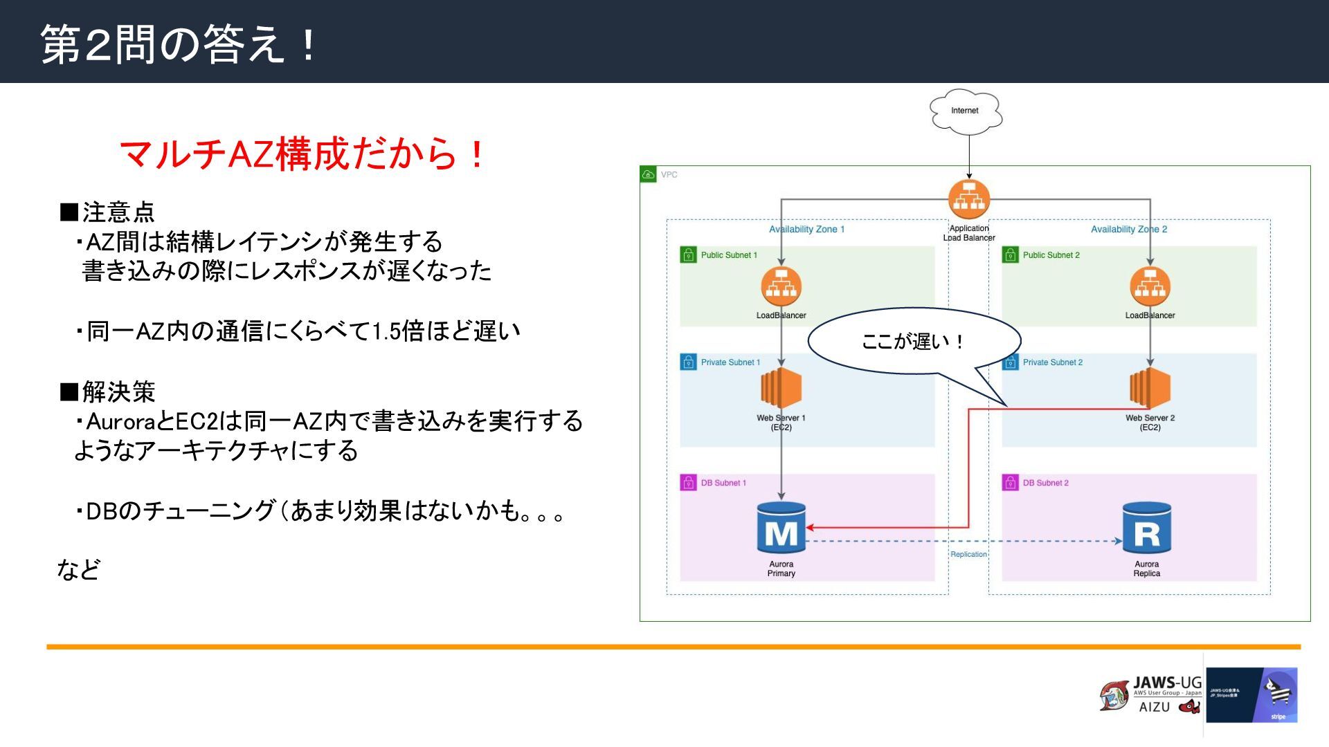 5 第2問の答え! マルチAZ構成だから! ここが遅い! ▪注意点 ・AZ間は結構レイテンシが発生する 書き込みの際にレスポンスが遅くなった ・同一AZ内の通信にくらべて1.5倍ほど遅い ▪解決策 ・AuroraとEC2は同一AZ内で書き込みを実行する