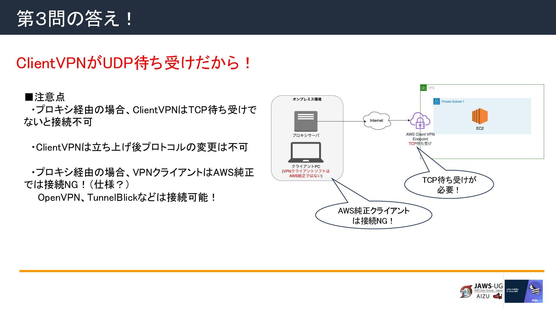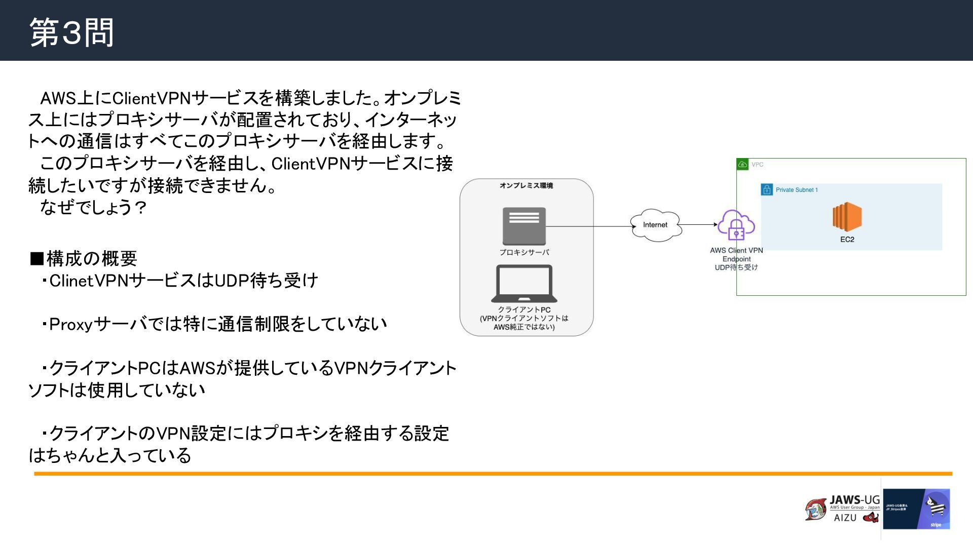 5 第3問 AWS上にClientVPNサービスを構築しました。オンプレミ ス上にはプロキシサーバが配置されており、インターネッ トへの通信はすべてこのプロキシサーバを経由します。 このプロキシサーバを経由し、ClientVPNサービスに接 続したいですが接続できません。 なぜでしょう? ▪構成の概要 ・ClinetVPNサービスはUDP待ち受け