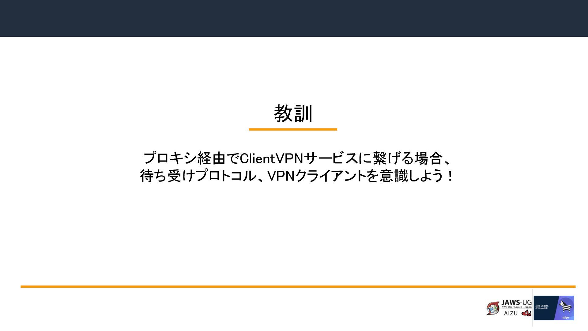 ・Proxyサーバでは特に通信制限をしていない ・クライアントPCはAWSが提供しているVPNクライアント ソフトは使用していない ・クライアントのVPN設定にはプロキシを経由する設定 はちゃんと入っている