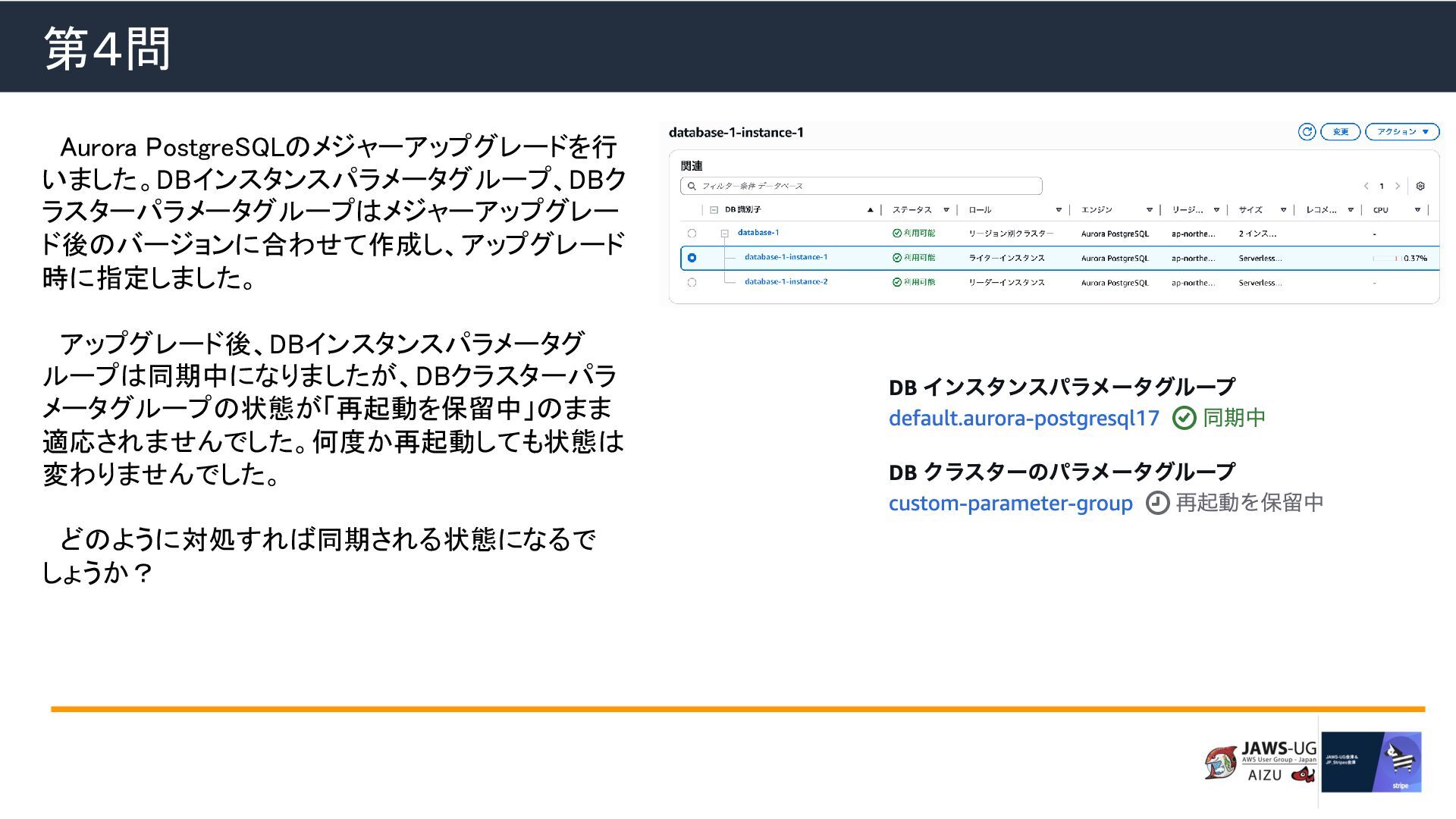 5 第4問 Aurora PostgreSQLのメジャーアップグレードを行 いました。DBインスタンスパラメータグループ、DBク ラスターパラメータグループはメジャーアップグレー ド後のバージョンに合わせて作成し、アップグレード 時に指定しました。 アップグレード後、DBインスタンスパラメータグ ループは同期中になりましたが、DBクラスターパラ
