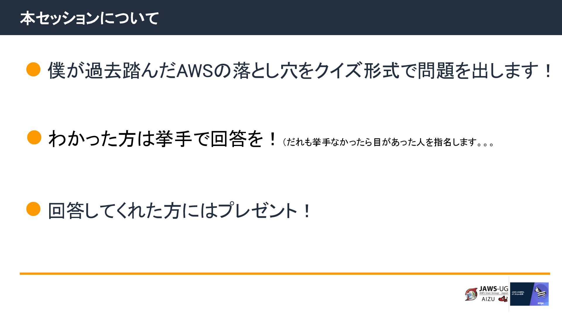 本セッションについて 5 僕が過去踏んだAWSの落とし穴をクイズ形式で問題を出します! わかった方は挙手で回答を!(だれも挙手なかったら目があった人を指名します。。。 回答してくれた方にはプレゼント!
