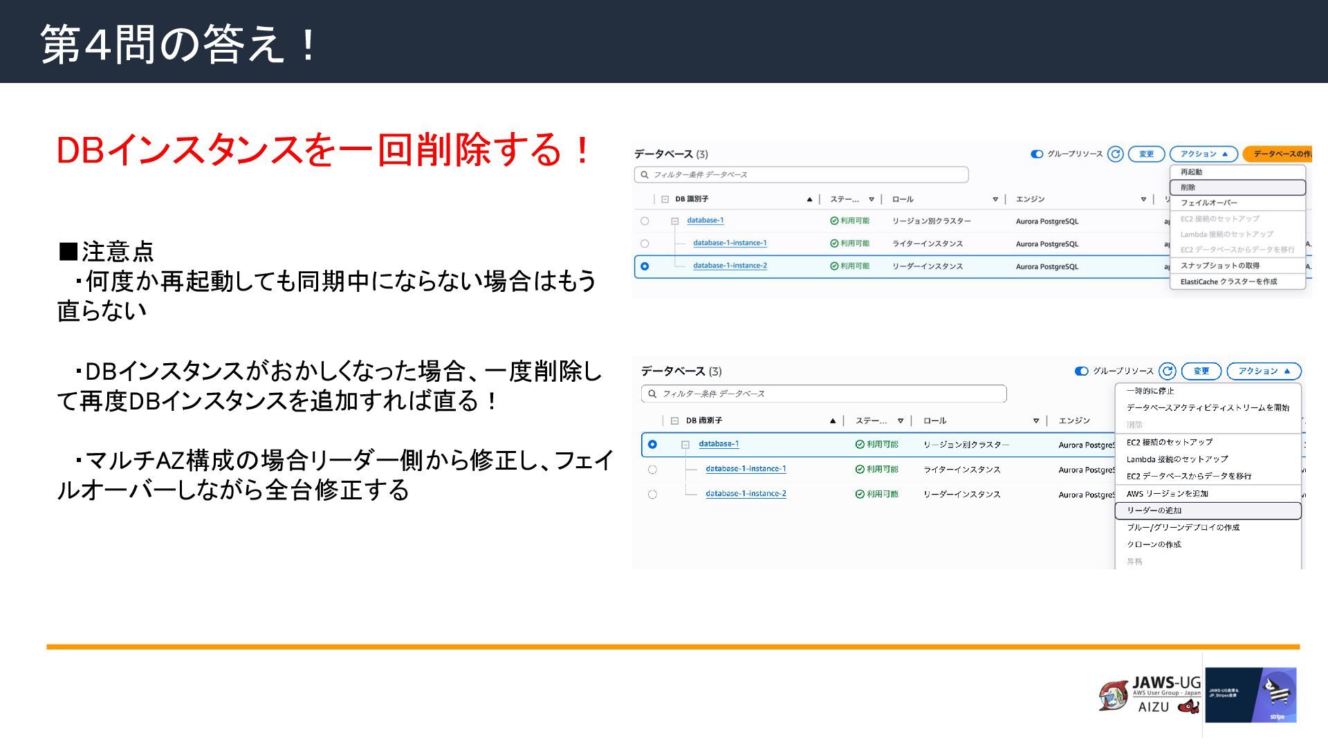 5 第4問の答え! DBインスタンスを一回削除する! ▪注意点 ・何度か再起動しても同期中にならない場合はもう 直らない ・DBインスタンスがおかしくなった場合、一度削除し て再度DBインスタンスを追加すれば直る! ・マルチAZ構成の場合リーダー側から修正し、フェイ ルオーバーしながら全台修正する