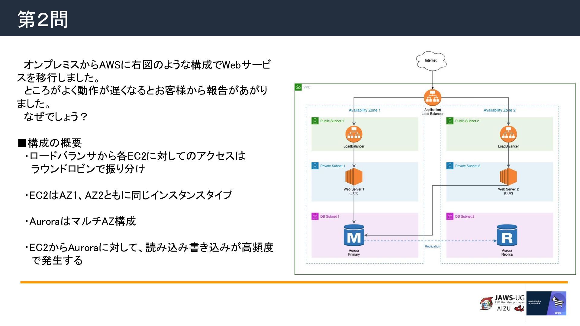 ・EC2はAZ1、AZ2ともに同じインスタンスタイプ ・AuroraはマルチAZ構成 ・EC2からAuroraに対して、読み込み書き込みが高頻度 で発生する