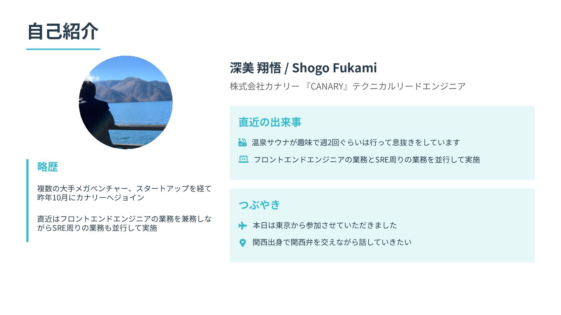 Fukami 株式会社カナリー 『CANARY』テクニカルリードエンジニア 直近の出来事 温泉サウナが趣味で週2回ぐらいは⾏って息抜きをしています フロントエンドエンジニアの業務とSRE周りの業務を並⾏して実施 つぶやき 本⽇は東京から参加させていただきました 関⻄出⾝で関⻄弁を交えながら話していきたい