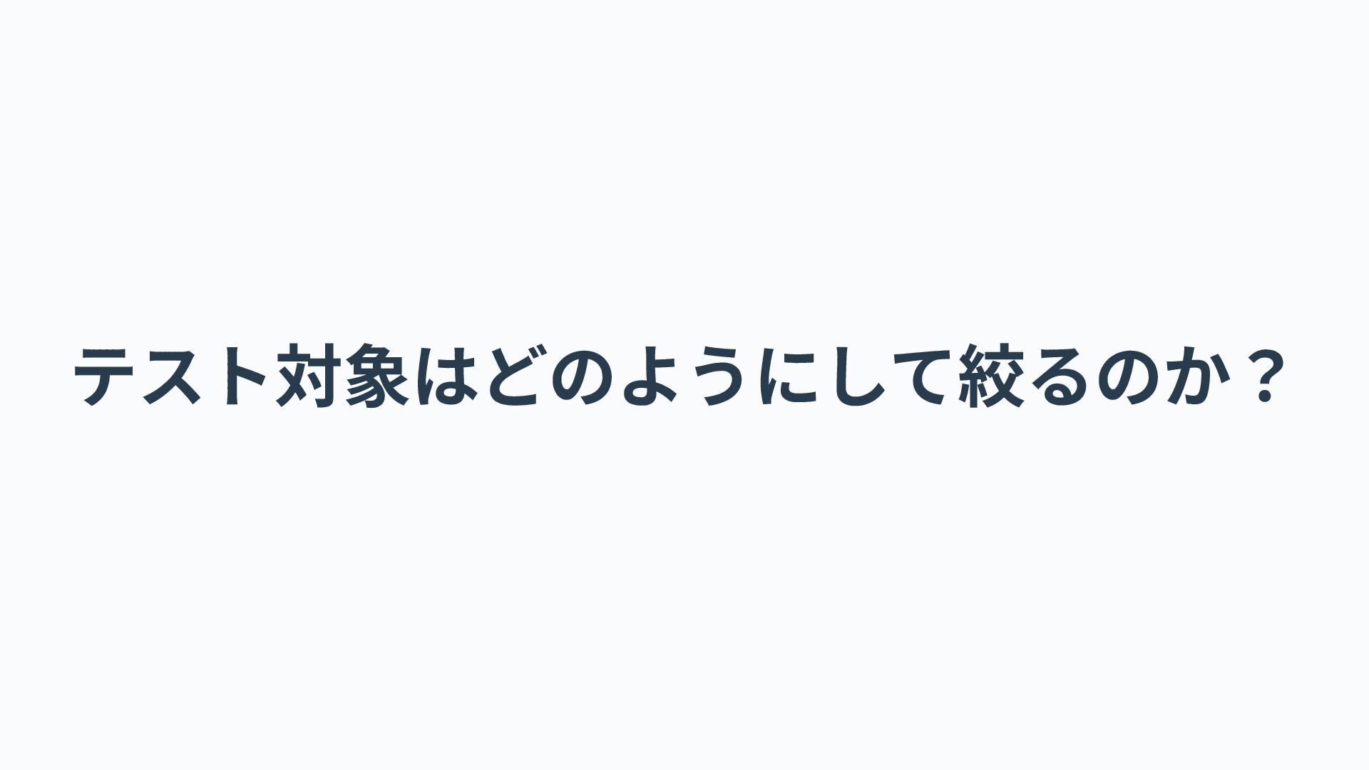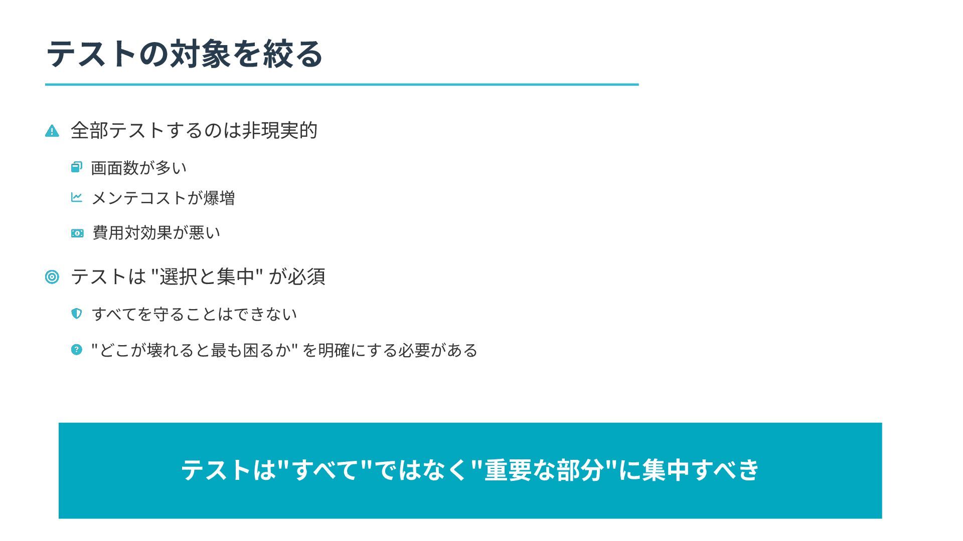 テストの対象を絞る 全部テストするのは⾮現実的 画⾯数が多い メンテコストが爆増 費⽤対効果が悪い テストは "選択と集中" が必須 すべてを守ることはできない "どこが壊れると最も困るか"